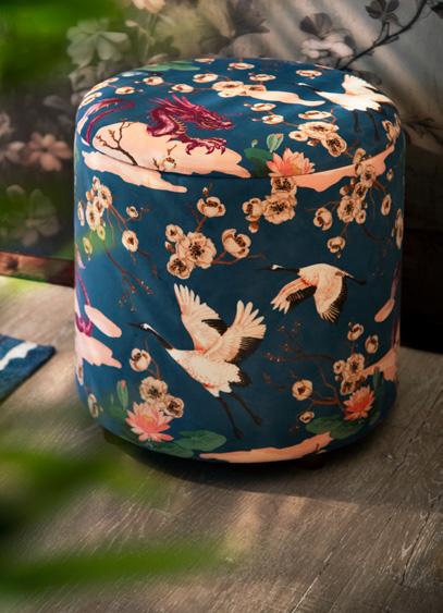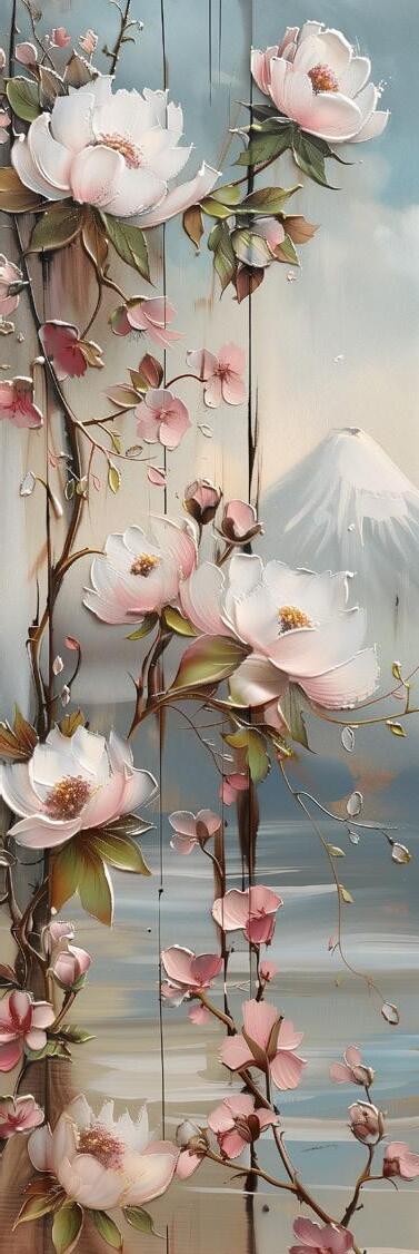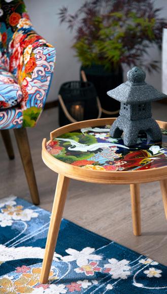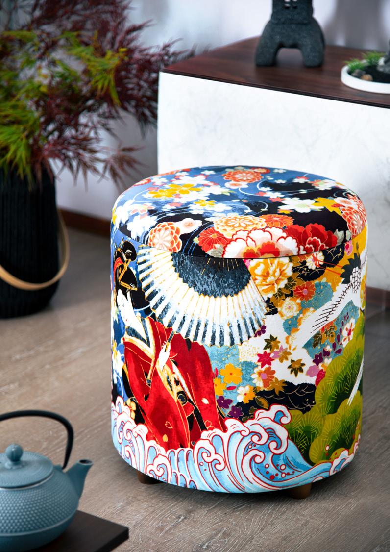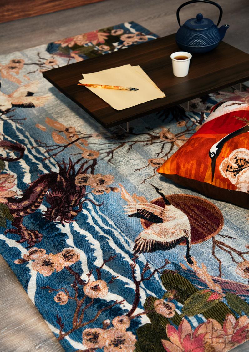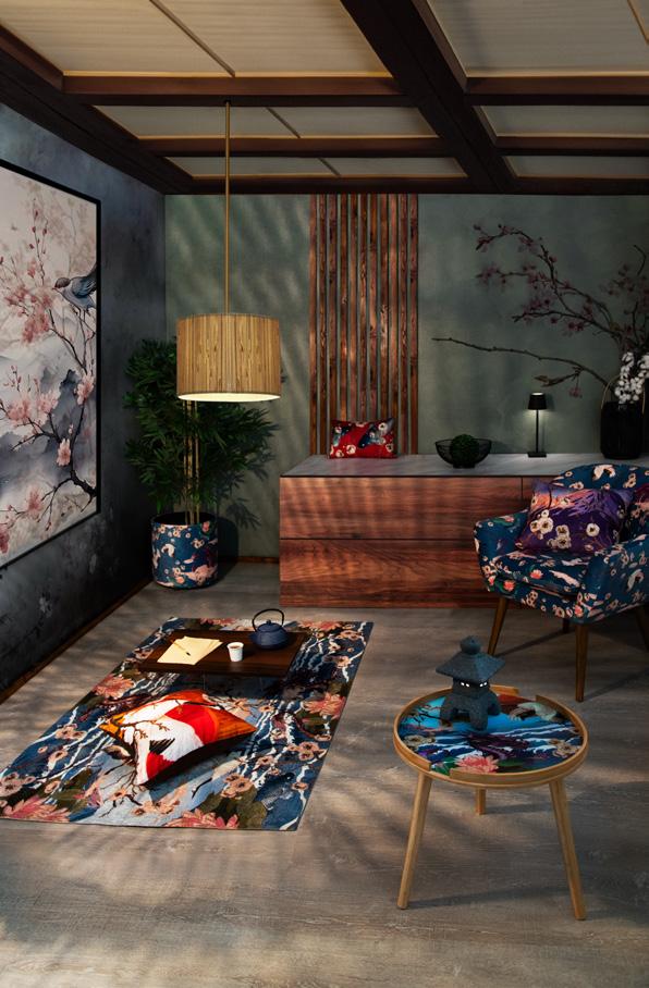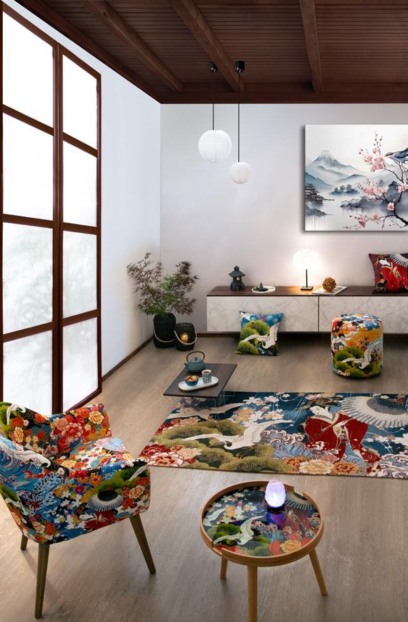 Serenità e bellezza naturale affiorano in ogni dettaglio di questo living ispirato al Giappone. In esso domina il Monte Fujicon le sue cime innevate che emergono maestose, avvolto da decorazioni di fiori di cotone bianchi che emanano un senso di purezza e leggerezza mentre eleganti aironi sembrano prendere vita con la loro grazia innata. Un drago sinuoso, simbolo di potenza e saggezza, crea un equilibrio perfetto tra forza e tranquillità. Ogni elemento decorativo contribuisce a rendere l’ambiente armonioso ed accogliente, un luogo in cui la mente si rilassa, dove natura e cultura giapponese si fondono in un’unica esperienza sensoriale e visiva.