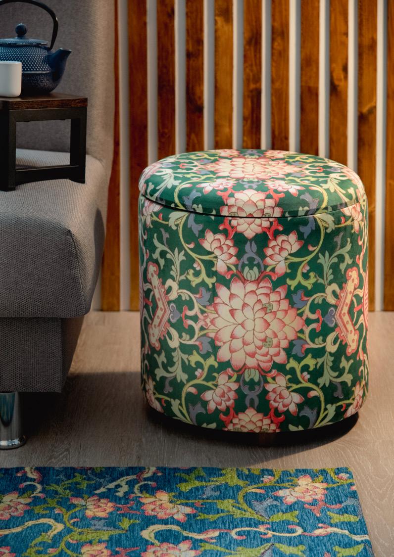 struttura interna in legno MDF, spessore 0,8 cm (coperchio 1 cm); tessuto in velluto di poliestere 280gms; spugna 100% poliuretano, densità 22kg/m3, corpo 1 cm (coperchio 3 cm); gambe in legno di abete.