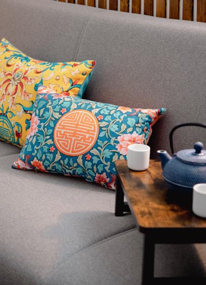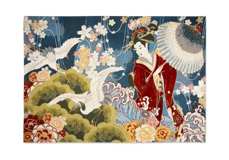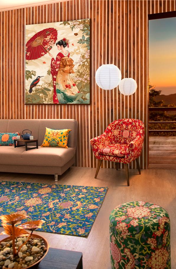 Salotto arredato in perfetto stile nipponico, dove una delicata ed elegante geisha dal kimono rosso accoglie gli ospiti. I toni accesi dei decori floreali mettoni in risalto aironi, simbolo di fortuna, che spiccano il volo, leggiardi ed armoniosi nei loro movimenti. Un tappeto finemente decorato si distingue sul pavimento neutro e caldo. Su di esso, morbidi cuscini offrono piccoli angoli di comfort e tocchi di colore. Onde tortuose ed avvolgenti richiamano l’oceano che circonda una terra bellissima e tutta da scoprire. Questo spazio, con la sua estetica essenziale e raffinata, dona un’atmosfera di pace e contemplazione, capace di richiamare la bellezza della cultura e della tradizione Giapponese unite alle bellezze naturali.