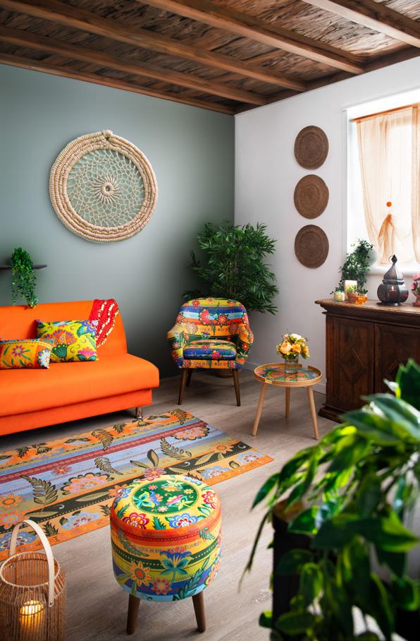 Un soggiorno che incarna l’essenza dello stile gipsy, dove ogni dettaglio racconta storie di viaggi lontani e libertà senza confini. Le sedute e i cuscini, riccamente decorati con motivi floreali e geometrici, evocano l’anima nomade e vibrante di culture antiche. Il tutto è accompagnato da un divano dal colore vivace. Il tappeto, un intreccio di colori caldi e disegni semplici, stende un invito a esplorare nuove terre, mentre i dettagli in legno e le decorazioni intrecciate sulle pareti celebrano l’artigianalità autentica. Il verde delle piante porta un tocco di natura mentre la luce, filtrata attraverso tende leggere, crea un’atmosfera magica, sospesa tra sogno e realtà. Questo è più di un soggiorno, è un luogo in cui l’anima gipsy trova la sua dimora, vibrante di vita e storie da raccontare.