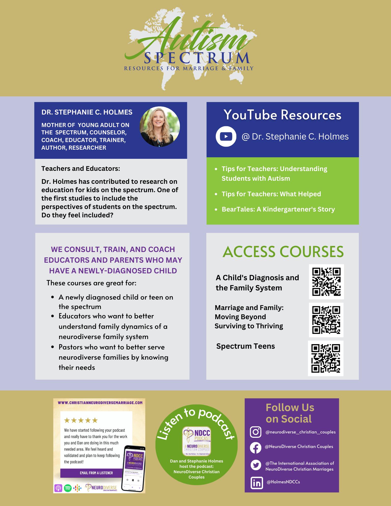 We know your family is a system, and often more than one person may be neurodiverse (ADHD, ASD, or other learning differences). We coach parents and marriages while including faith. Courses are available for parents who have a child newly diagnosed or transitioning into adolescents. Upon completing a course, we coach you through your next steps or connect you with another coach who may better fit your family situation. Dr. Holmes and her husband, Dan, coach NeuroDiverse couples (where one partner or both are on the spectrum).
