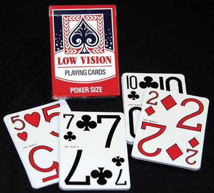 The numbers and letters on these cards are shown in two sizes, 3/4” and 1-1/2” to meet the visual needs of individual players. The characters and symbols are red, outlined in black.