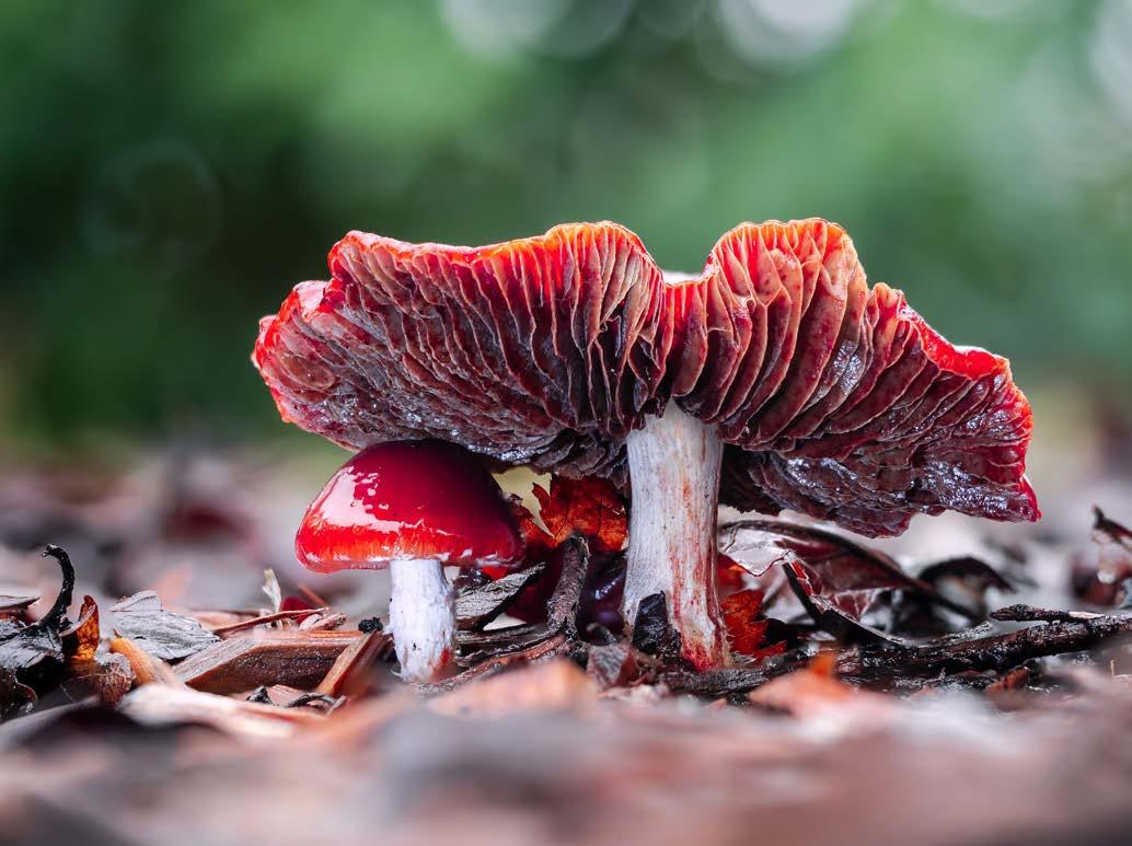A baby ‘Redlead Roundhead’ or ‘Chip Cherry’ mushroom snuggles into it’s adult for some welcomed winter warmth!