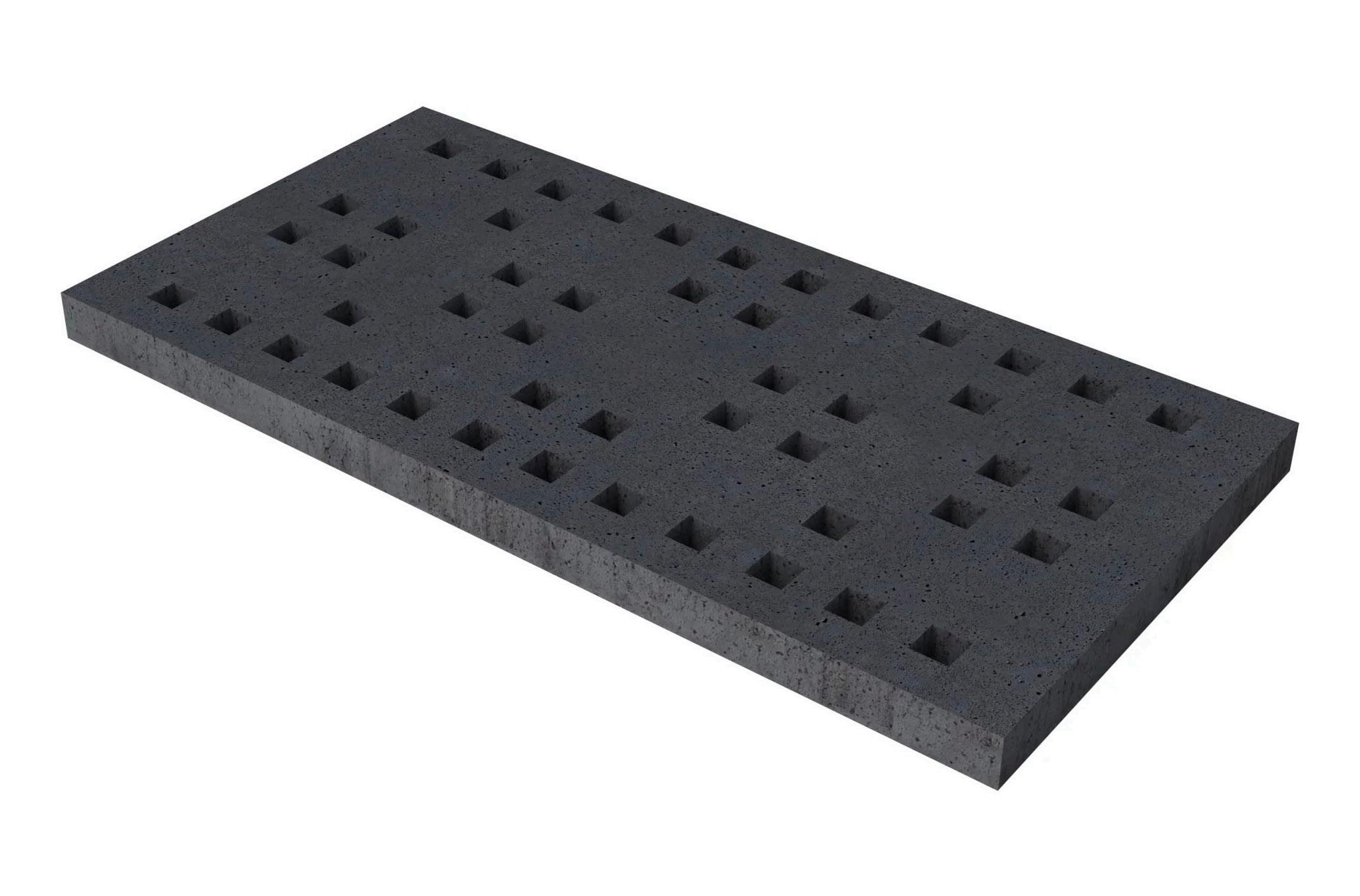 Het grote formaat van 200x100x10 cm en de strakke vormgeving creëren een rustig, modern beeld met weinig onderhoud. Voor een speels resultaat zijn de platen gemakkelijk te combineren met een dichte variant.