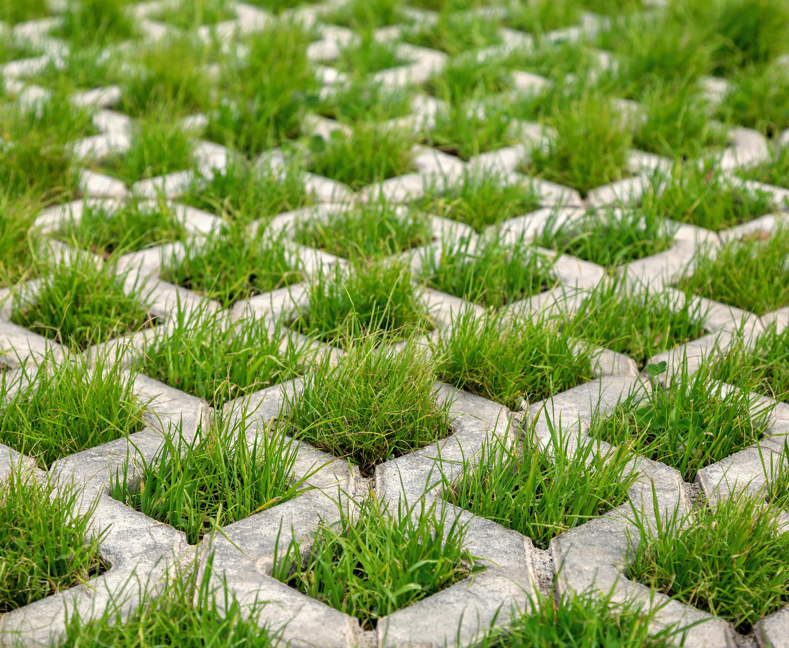 De waterpasserende bestrating biedt ruimte voor grasgroei voor een natuurlijke uitstraling. Je kunt de holtes ook vullen met grind of split.
