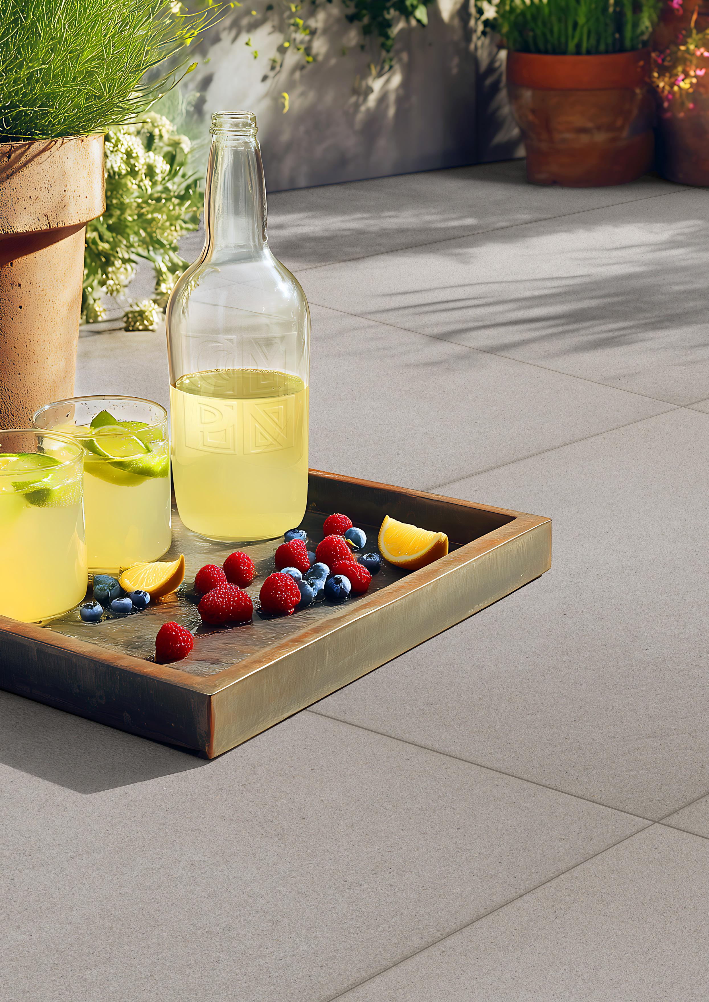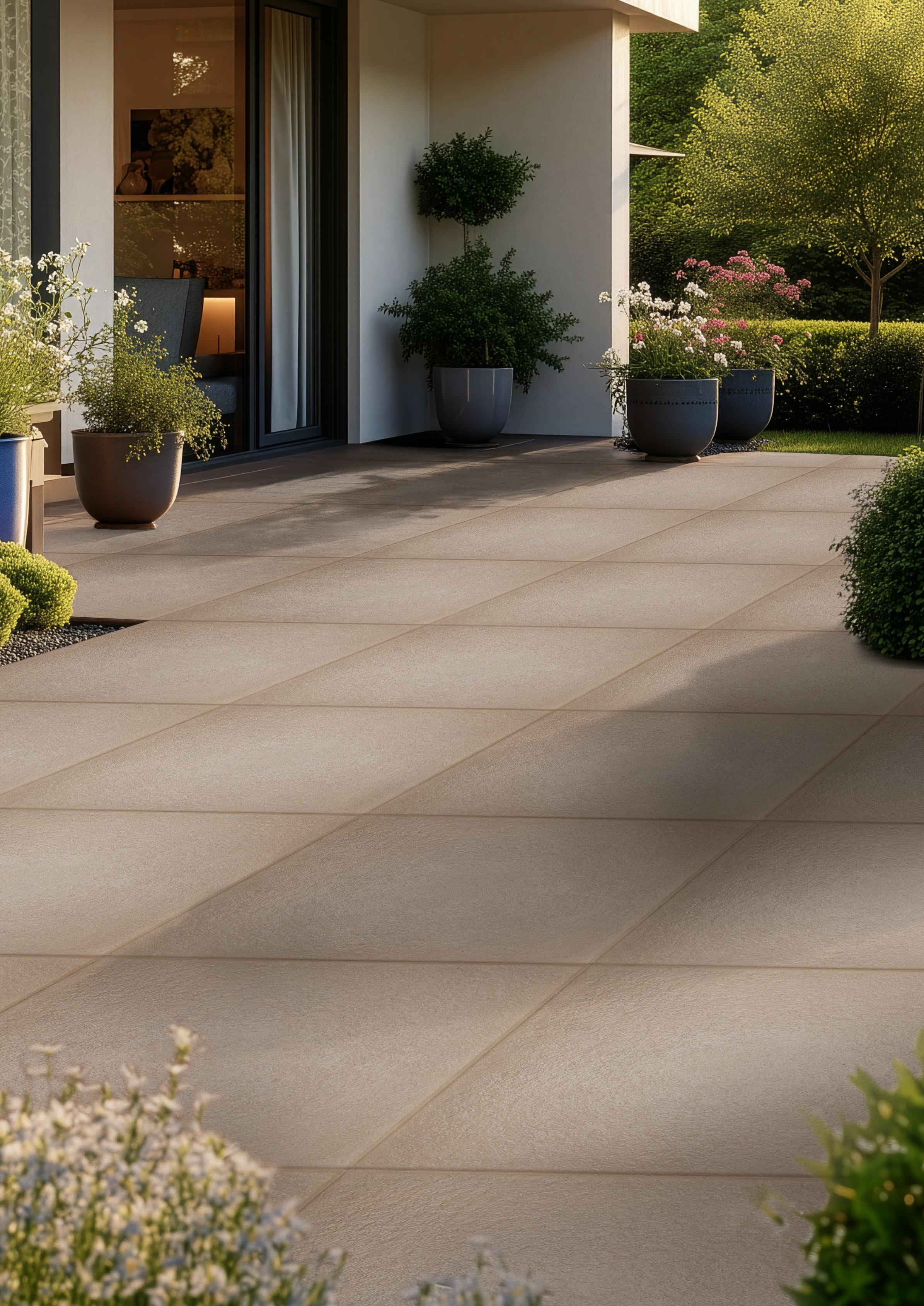 Die Fliesen sind leicht, pflegeleicht und daher sogar für Dachterrassen geeignet. So verbindet Optimum natürliche Schönheit mit praktischer Funktionalität –für einen Außenbereich, der mühelos zum Leben erwacht.