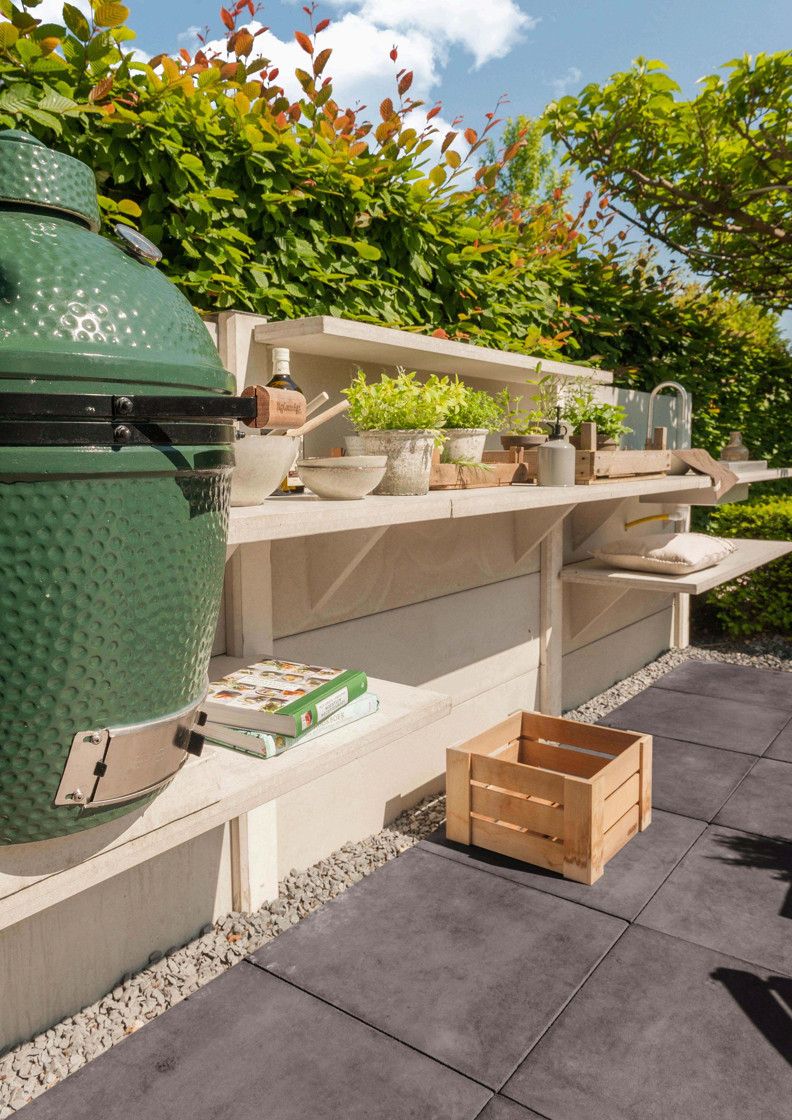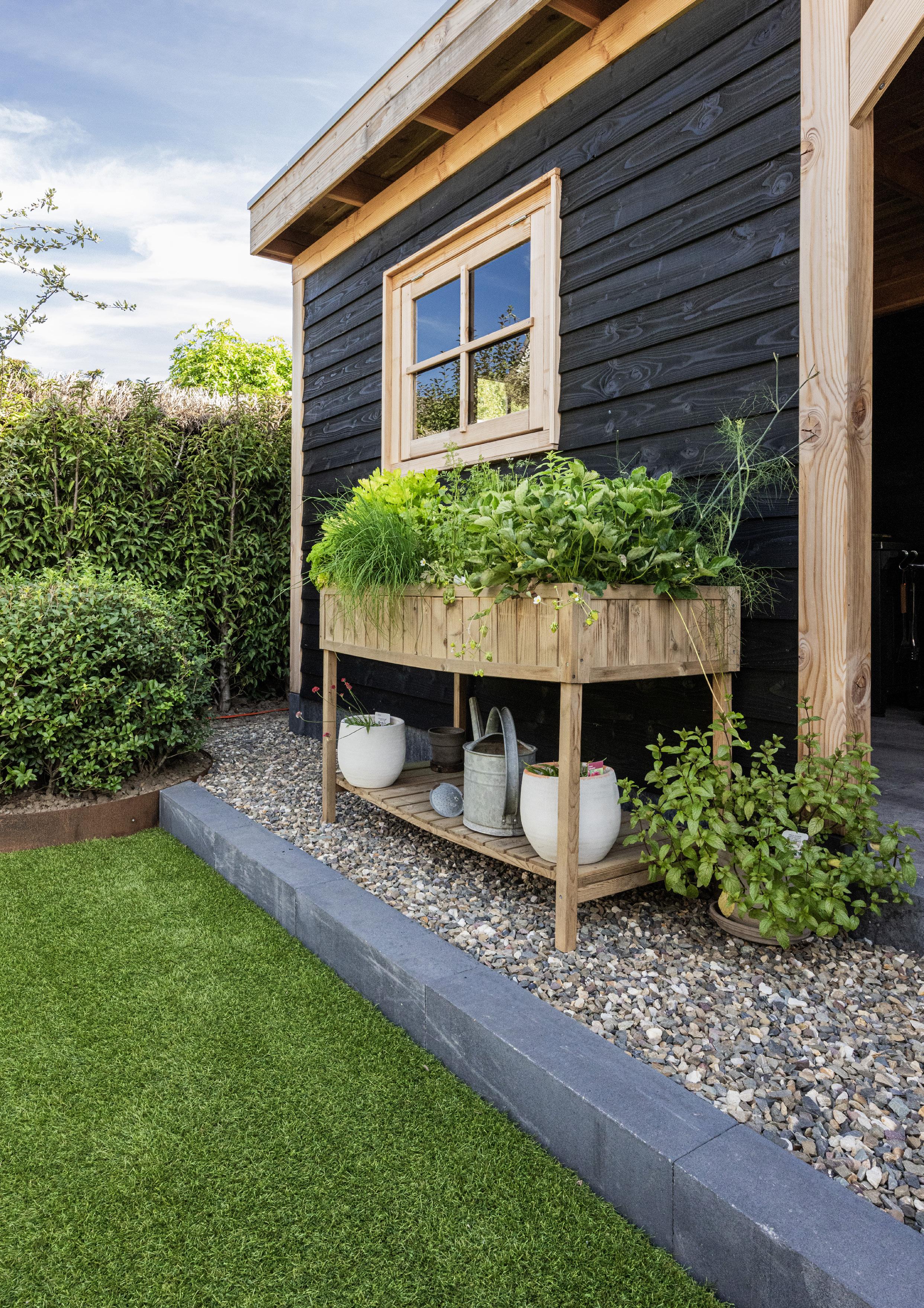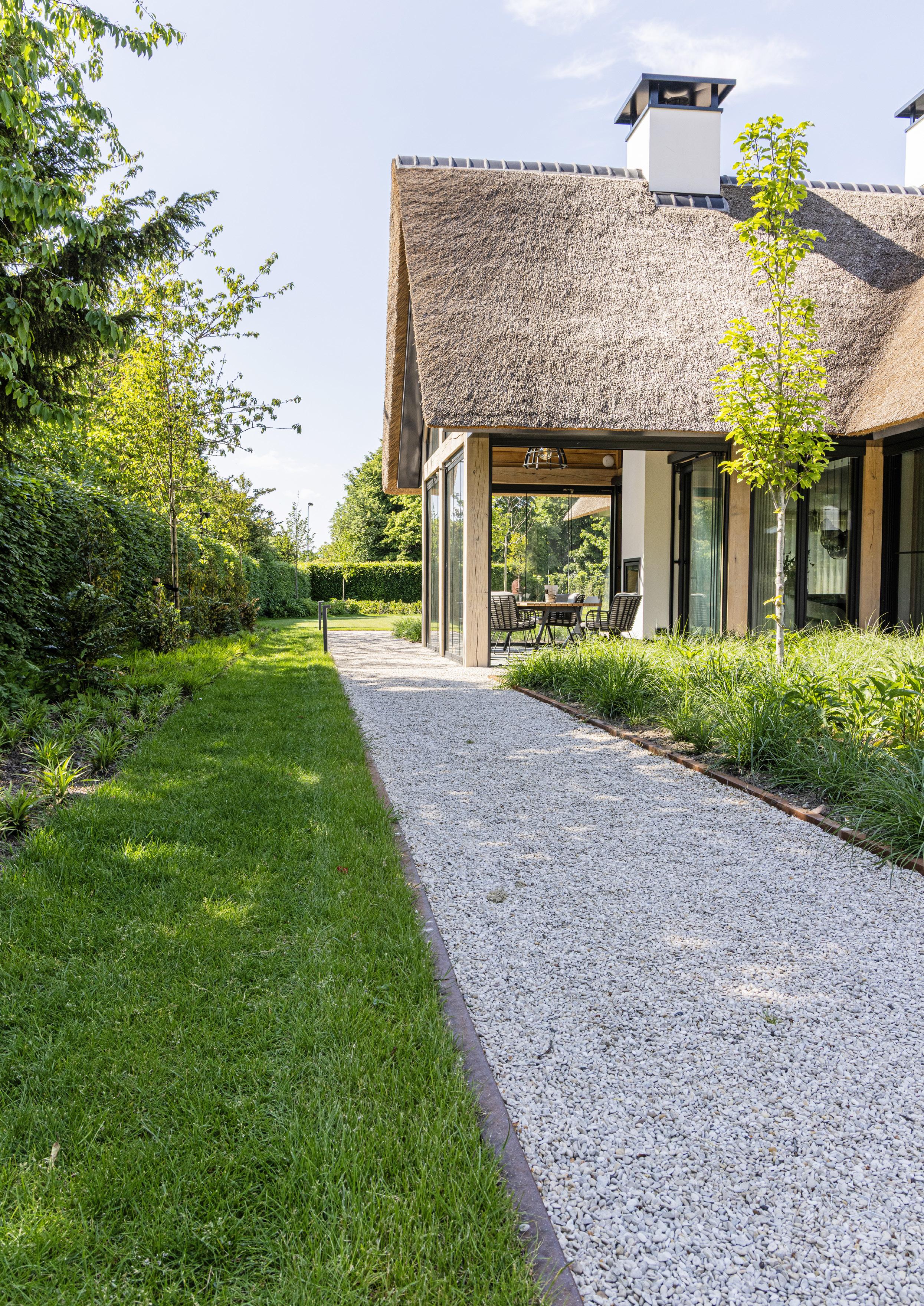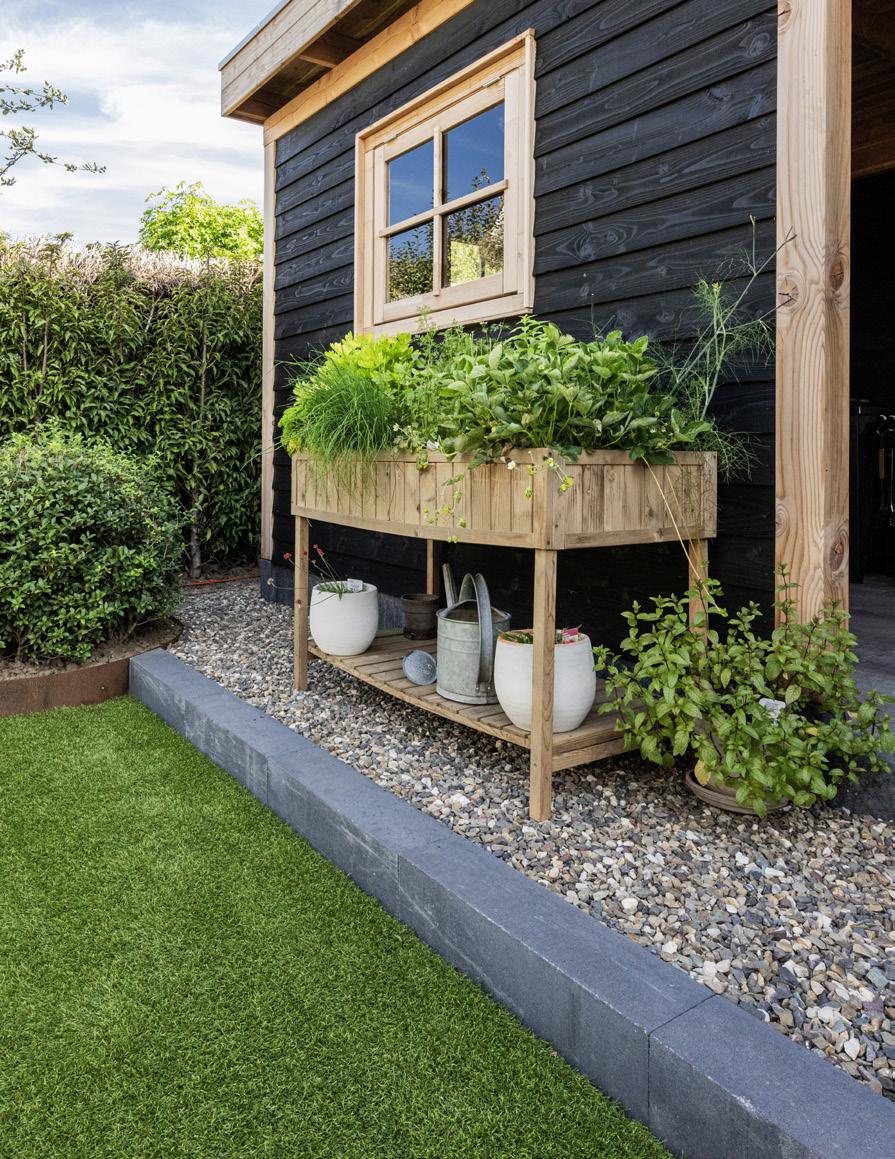 Die Kombination aus großen Fliesen und Kies sorgt für eine klare, moderne Basis, während das Grün in den erhöhten Pflanzkästen und den üppigen Beeten für Lebendigkeit und Farbe sorgt. So fühlt sich der Garten wie eine Erweiterung unseres Hauses an, ein Ort, den wir das ganze Jahr über genießen können.”