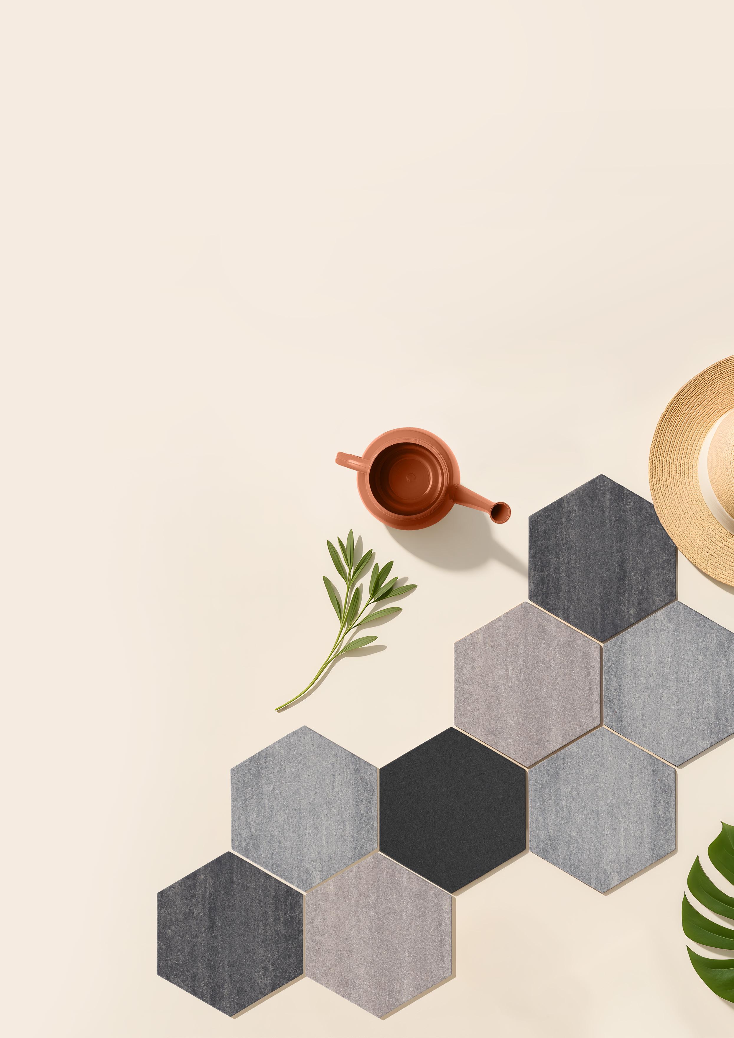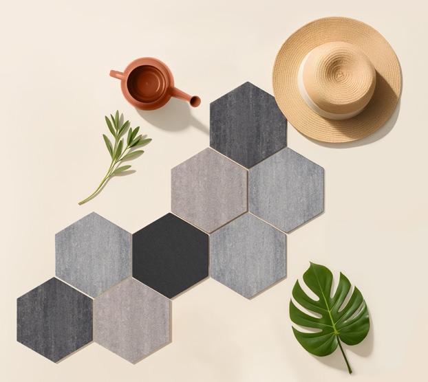 Auch die sechseckige Fliese, inspiriert von der Einrichtungsbranche, verleiht Ihrem Außenbereich ein modernes und verspieltes Aussehen. Verwenden Sie diese vielseitige Form für eine auffällige Terrasse oder als Trittfliese in Kies, Gras oder Beeten – die Möglichkeiten sind endlos.