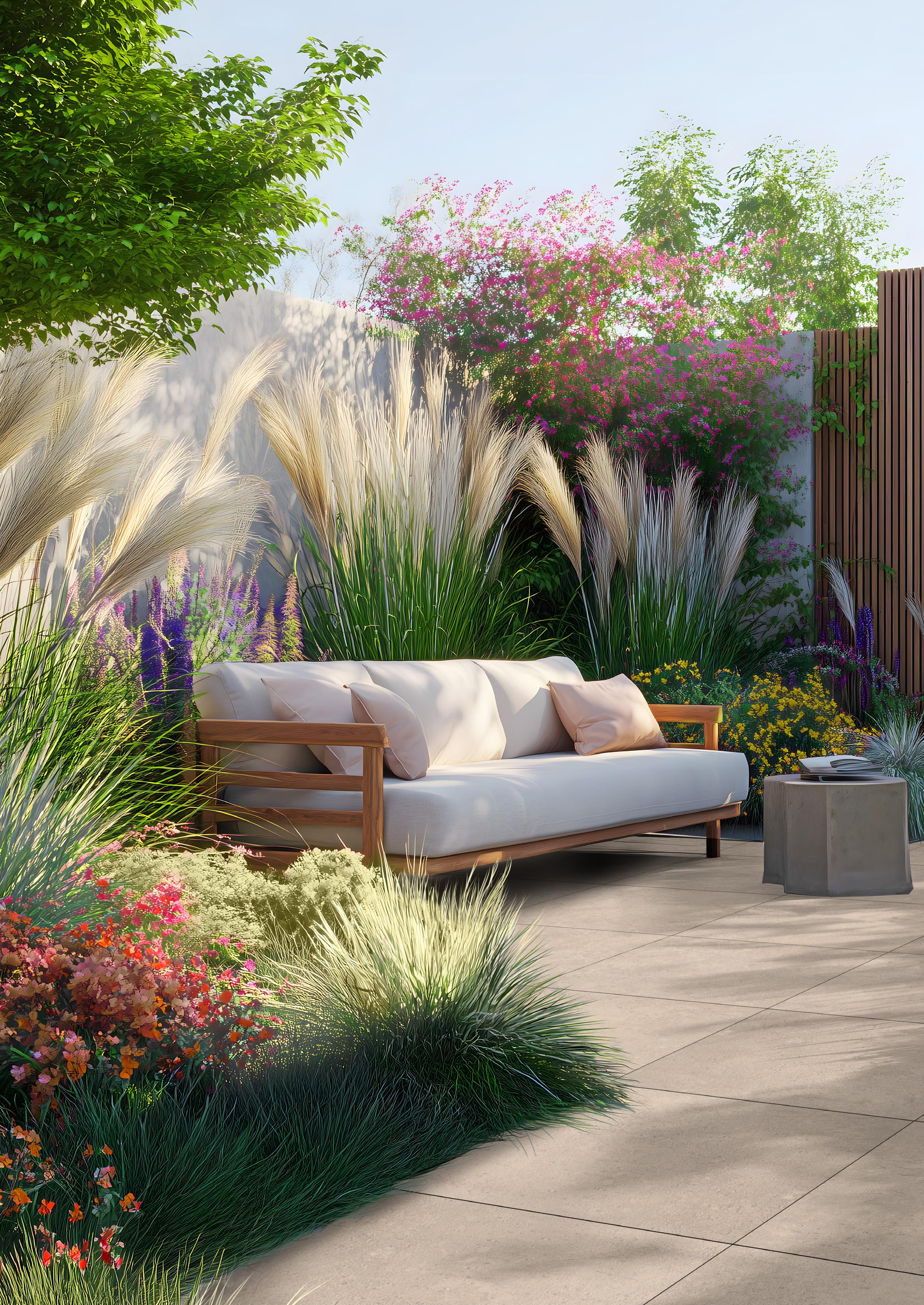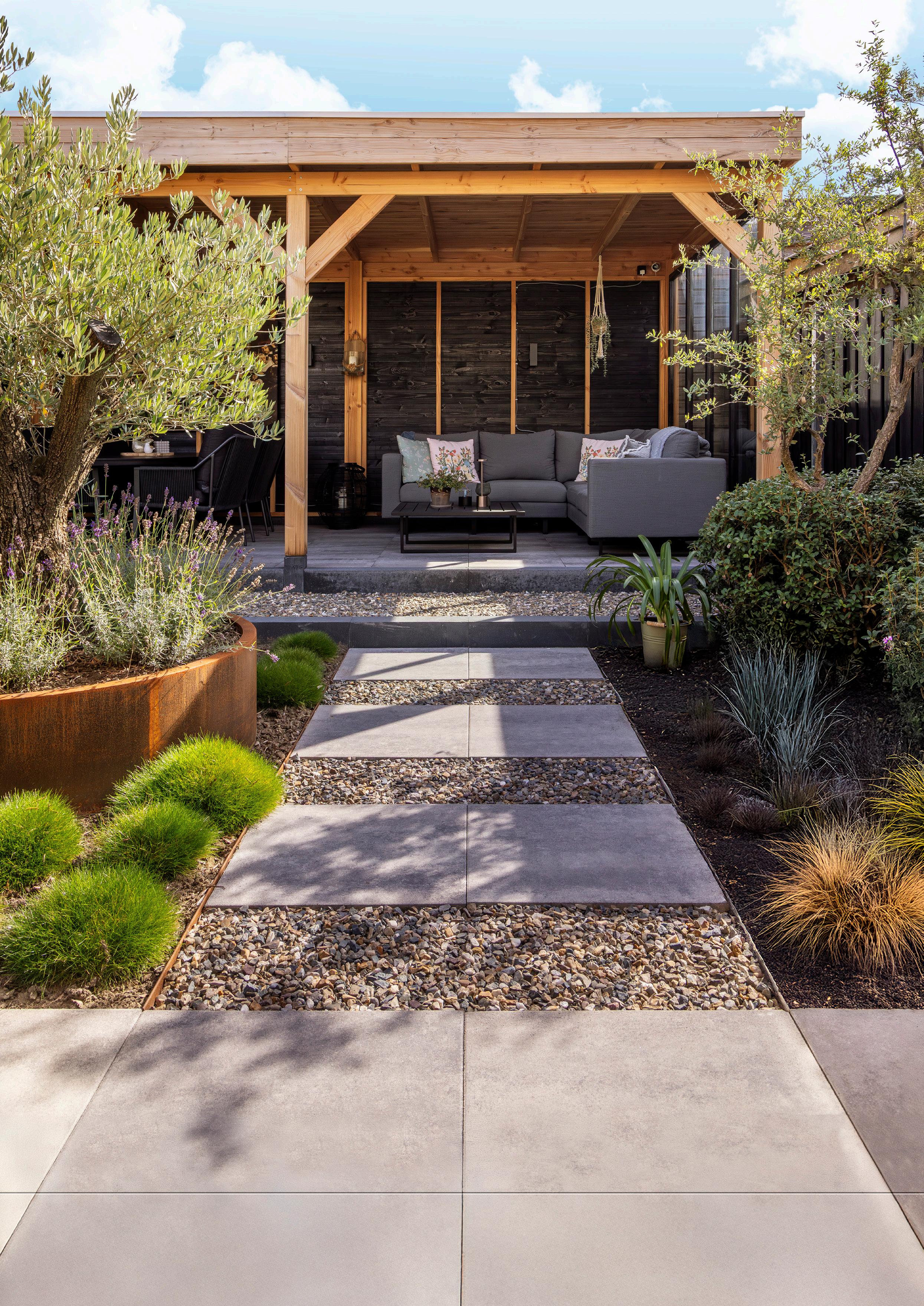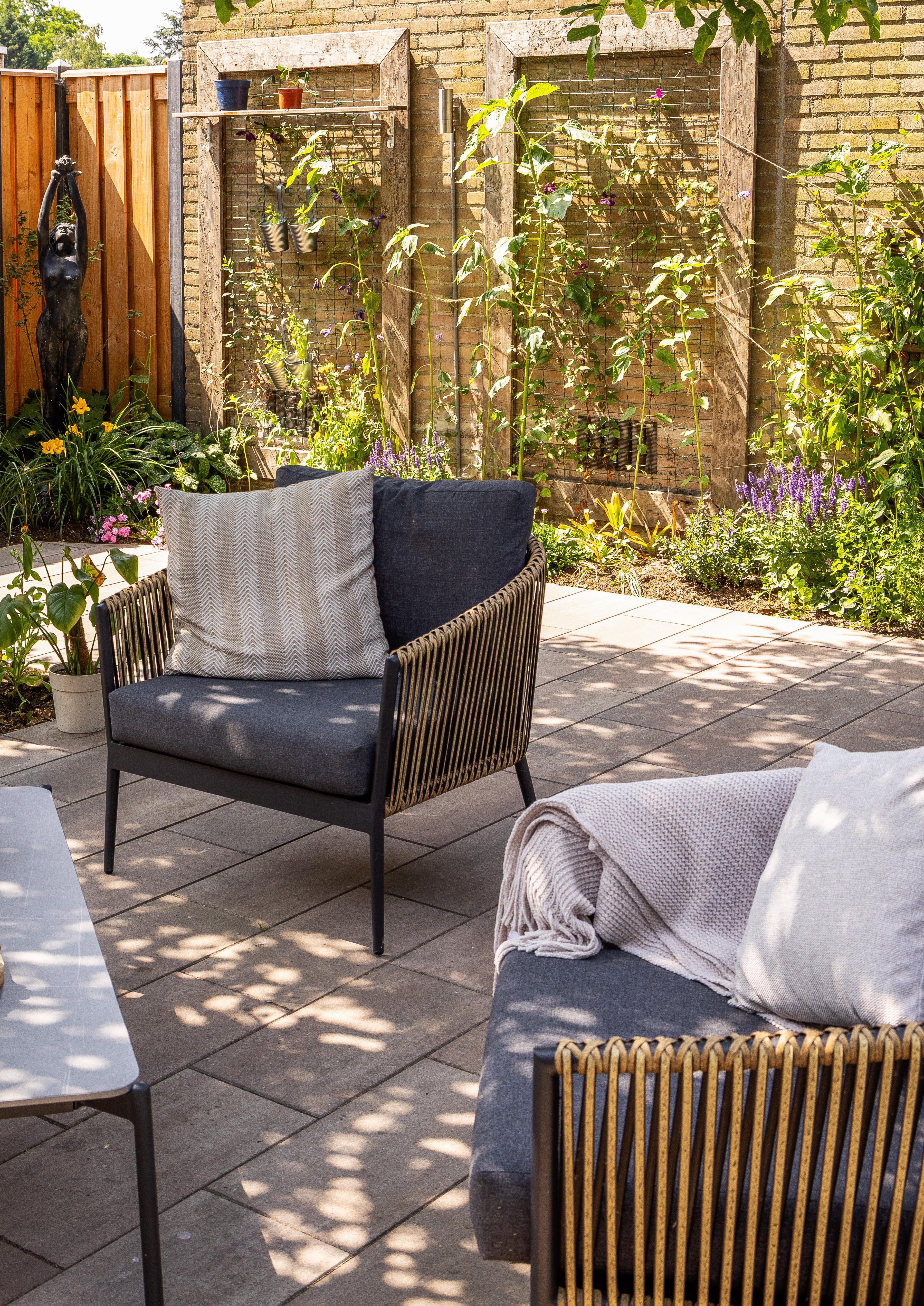“Als wir mit der Gestaltung des Gartens begannen, wollten wir einen Ort schaffen, der sowohl Ruhe als auch Gemütlichkeit ausstrahlt. Die Überdachung wurde zum Herzstück des Gartens: ein geschützter Ort, an dem wir gemeinsam essen oder in der Lounge-Ecke entspannen können.