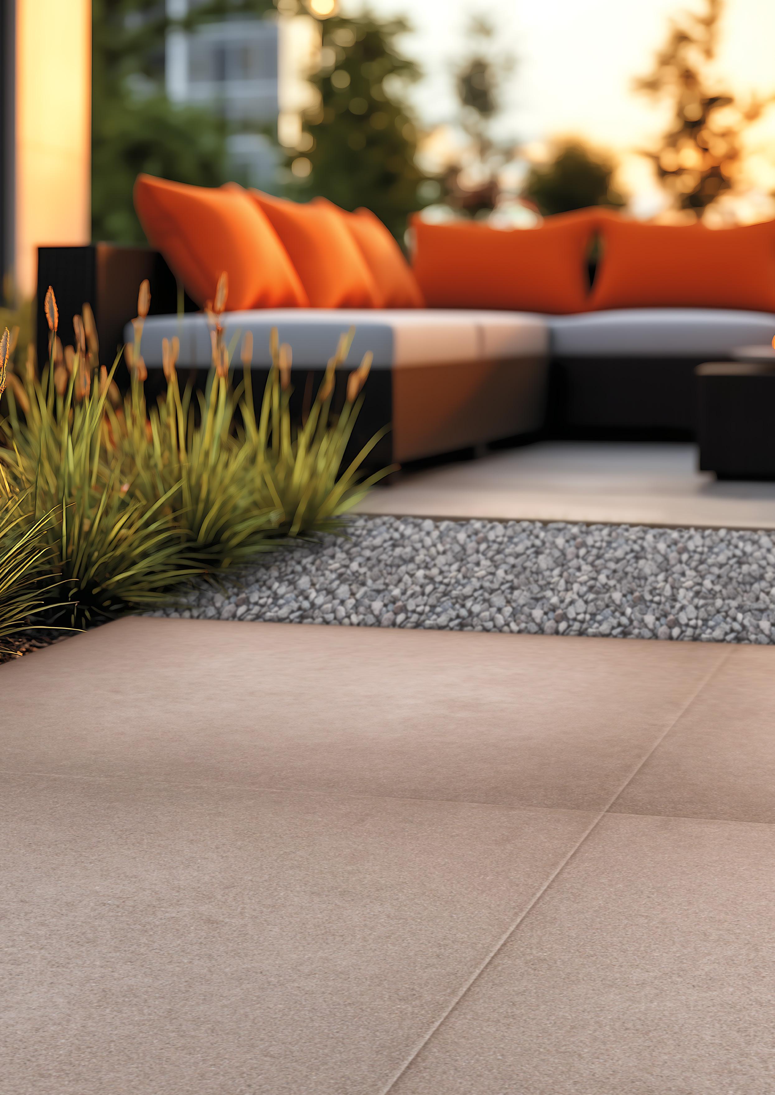 Cosmopolitan ist eine hochwertige Betonfliese mit dezentem Relief. Die einfarbigen, naturgetreuen Farben (Beige, Sand und Taupe) sorgen für eine ruhige, luxuriöse Ausstrahlung und bringen Pflanzen schön zur Geltung. Dank ihrer schmutzabweisenden und pflegeleichten Eigenschaften eignen sich die Fliesen ideal für große Terrassen mit einer stilvollen, zurückhaltenden Atmosphäre.