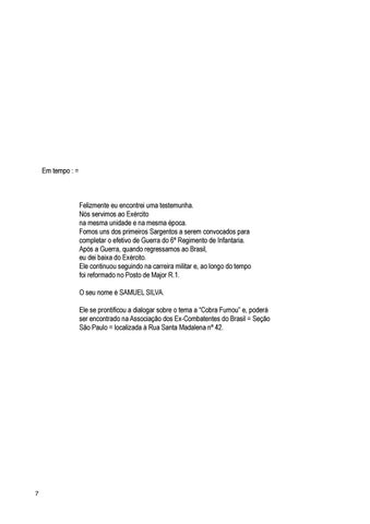 Felizmente eu encontrei uma testemunha. Nós servimos ao Exército na mesma unidade e na mesma época. Fomos uns dos primeiros Sargentos a serem convocados para completar o efetivo de Guerra do 6º Regimento de Infantaria. Após a Guerra, quando regressamos ao Brasil, eu dei baixa do Exército. Ele continuou seguindo na carreira militar e, ao longo do tempo foi reformado no Posto de Major R.1. O seu nome é SAMUEL SILVA. Ele se prontificou a dialogar sobre o tema a “Cobra Fumou” e, poderá ser encontrado na Associação dos Ex-Combatentes do Brasil = Seção São Paulo = localizada à Rua Santa Madalena nº 42.