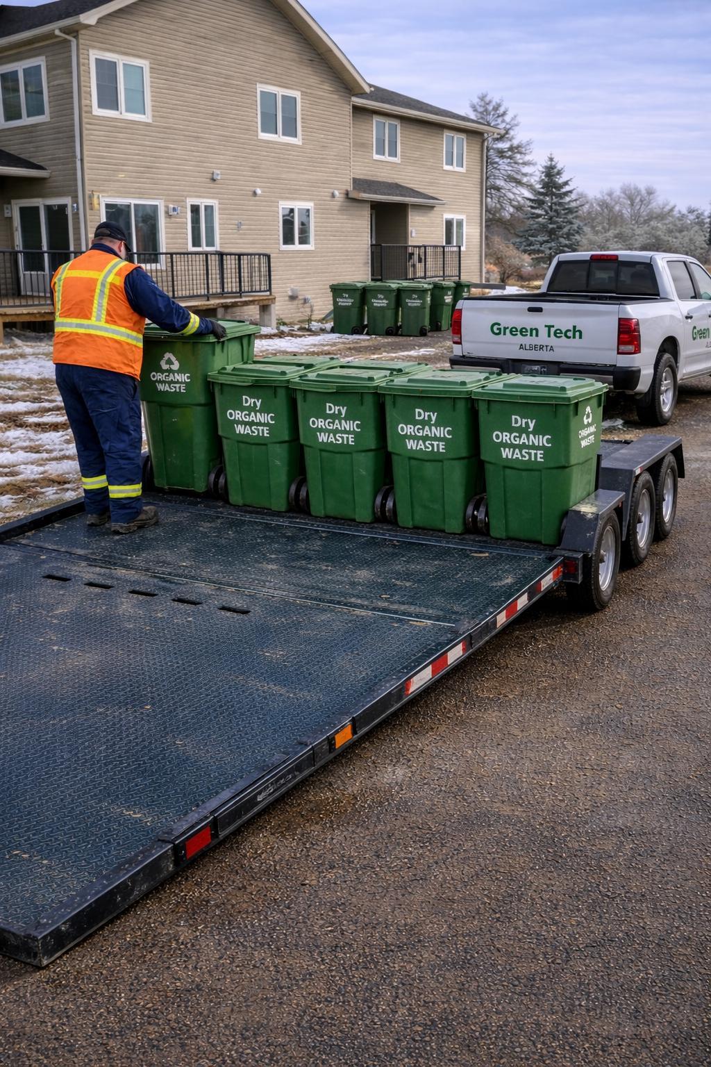 Greentotesfullofwetorganicswerepickedup2xweek.8xper4-week cycle7-totes/binsperpick-up. Greentotesaretransportedtoa northernAlbertarecycler.