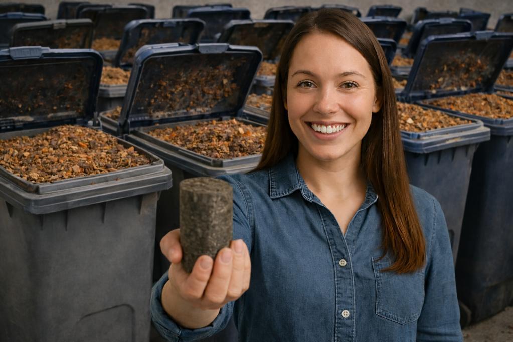 Dehydratedfoodwasteistransformedintoahigh-valuebiomassfeedstockat theprocessingcenter.