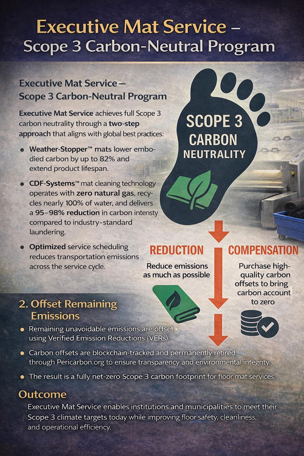 WithintheExecutiveMatServiceproductionfacility,approximately1,000poundsof biomassbriquettesareconsumedinternallytogeneratethermalenergyforplant heatingoperations.Thisinternalutilizationoffsetsconventionalfossilfuel consumptionanddirectlylowersthefacility’scarbonintensity.