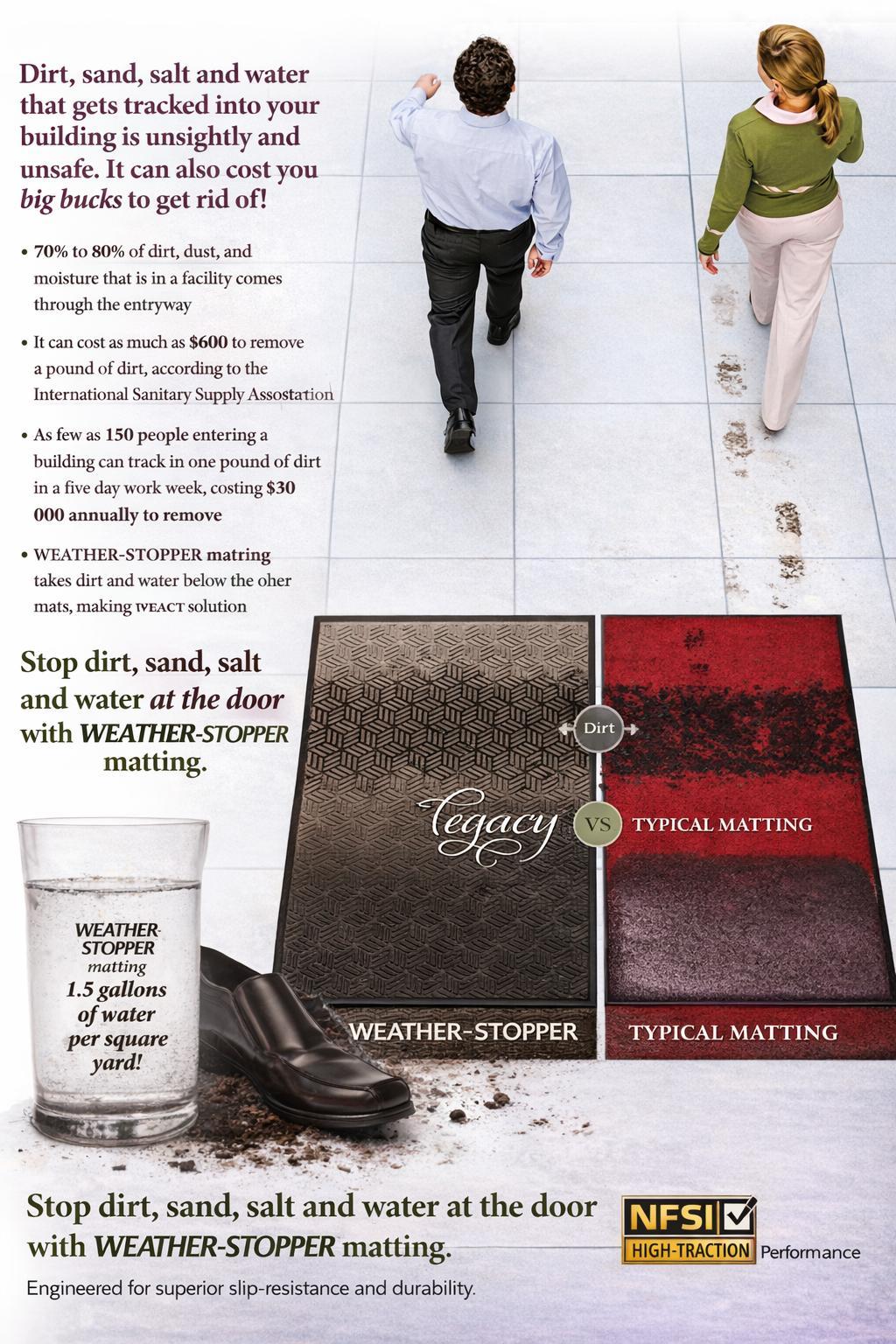 • SoilContainment:Upto80%ofdirtentersafacilityonfootwear.Effectivemattingtraps andholdsthisdebrisbeforeitmigratesontofinishedflooring.