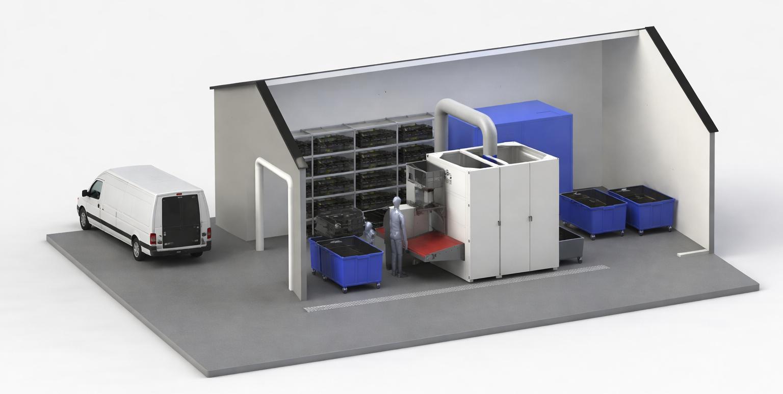 Ateachlocation,pre-weighed120-litertotescontainingdehydratedorganicmaterial areloadedontoflatbedorenclosedtrailers.Becausethematerialhasbeendriedonsite,toteweightsareconsistentandsignificantlylighterthanwetwaste,enabling higherpayloaddensityandfewertransportcycles.
