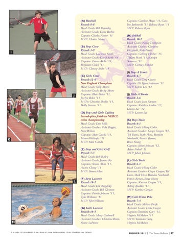 Record: 12-0 New England Champions Head Coach: Sally Morris Assistant Coach: Becky Moore Captains: Blair Baker ’11, Jocelyn Bohn ’11 MVPs: Christine Devlin ’11, Holly Stevens ’11 (D) Boys and Girls Cycling