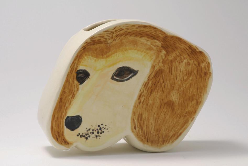 Freddie Chang ’25, Sharkitecture, 2025, oil on canvas; Tallis Guthrie ’25, Piper, 2024, stoneware and underglaze (from the 2025 Advanced Student Art Exhibition)