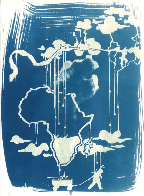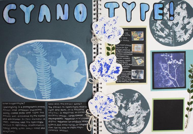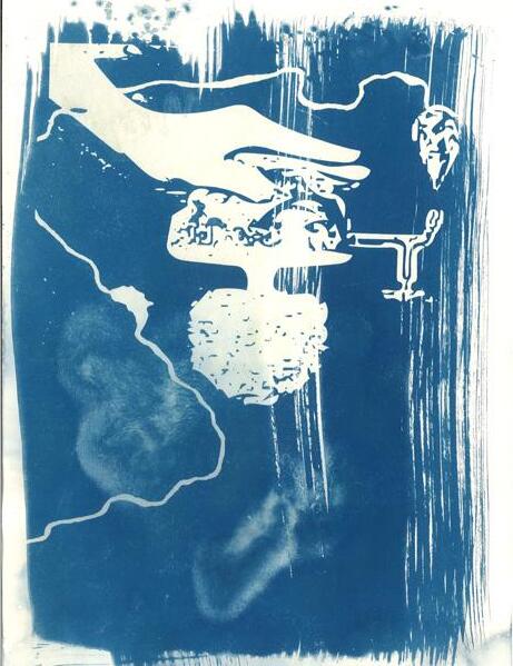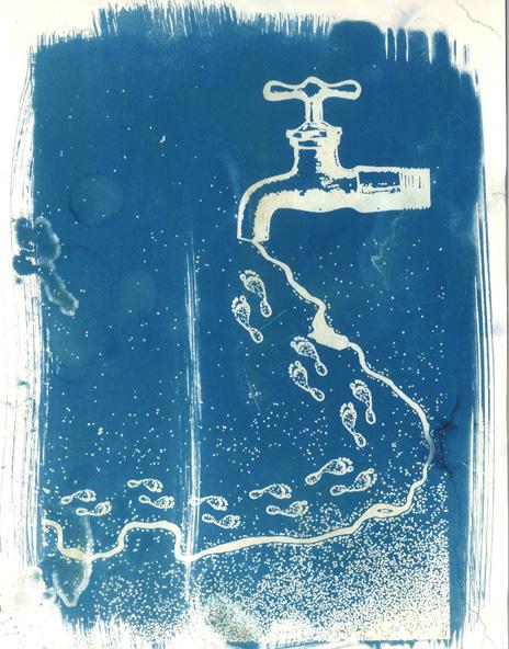 Exeter School’s ‘Young Artists Collective’ (YAC). Each member was asked to create a digital image which responded to the growing concern of the water crisis and causes of climate change that face our world today. These images were printed onto acetate to act as a photographic negative. Then light sensitive chemicals were painted onto paper and the negatives placed on top and left out in the sun to develop, creating these stunning results.