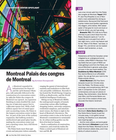 s Montreal expanded its infrastructure for Expo 67 and the 1976 Summer Olympics, talk naturally followed to the construction of a convention center. In 1983 the Palais des congres de Montreal was opened. An expansion finishing in 2002 doubled the starting size of 990,000 square feet to 1,980,000 square feet. With a half million square feet of rental space and 113 meeting rooms, the Palais is the largest convention center in Quebec. As part of the turn of the century expansion, Hal Indberg created a multicolored 390 panel glass facade, making the convention center not just a meeting venue, but a full blown work of art. The Palais hosts more than 350 events and 900,000 visitors annually, 22 Jan/Feb/Mar 2026 Exhibit City News