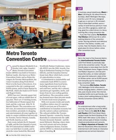 PLAY For entertainment after a long conference day, the options around the MTCC are rich. There is the John W. H. Bassett Theatre (255 Front Street West), located inside the North Building of the MTCC itself. With about 1,232 seats, it hosts various types of shows including theatrical productions and concerts. And Ripley’s Aquarium of Canada (288 Bremner Boulevard) offers educational entertainment with hands-on interactive experiences and animal interaction.