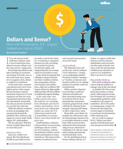 simple: we oppose tariffs that increase costs for industry stakeholders and travel policies that make it harder and more costly for international exhibitors and attendees to come to U.S. tradeshows. That’s our focus for 2026. Beyond the Beltway ECA will be looking for other ways to help the industry to manage costs in the year ahead. As Exhibit City News wrote about last summer, in their article Addressing the Guideline Overload, the overload of sustainability guidelines adds complexity and expense to tradeshows. ECA will continue championing a single U.S. framework that aligns the current tangle of standards to accelerate decarbonization while reducing costs. Are you ready to support ECA’s “dollars and sense” agenda? Visit ECAadvocacy. com and get involved today! Tommy Goodwin is Executive Vice President for the Exhibitions & Conferences Alliance, the unified government relations and public policy voice of the tradeshow industry.