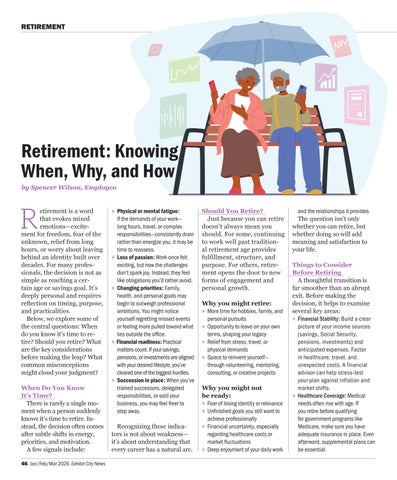 etirement is a word that evokes mixed emotions—excitement for freedom, fear of the unknown, relief from long hours, or worry about leaving behind an identity built over decades. For many professionals, the decision is not as simple as reaching a certain age or savings goal. It’s deeply personal and requires reflection on timing, purpose, and practicalities. Below, we explore some of the central questions: When do you know it’s time to retire? Should you retire? What are the key considerations before making the leap? What common misconceptions might cloud your judgment? When Do You Know It’s Time? There is rarely a single moment when a person suddenly knows it’s time to retire. Instead, the decision often comes after subtle shifts in energy, priorities, and motivation. A few signals include: 46 Jan/Feb/Mar 2026 Exhibit City News