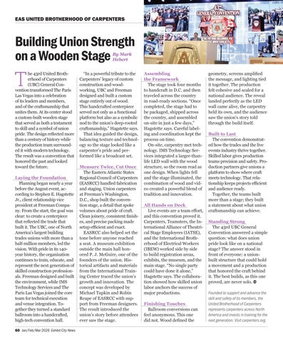 he 43rd United Brotherhood of Carpenters (UBC) General Convention transformed The Paris Las Vegas into a celebration of its leaders and members, and of the craftsmanship that unites them. At its center stood a custom-built wooden stage that served as both a testament to skill and a symbol of union pride. The design reflected more than a century of history while the production team surrounded it with modern technology. The result was a convention that honored the past and looked toward the future. Laying the Foundation Planning began nearly a year before the August event, according to Stephen E. Hagstette Jr., client relationship vice president at Freeman Company. From the start, the goal was clear: to create a centerpiece that reflected the trade that built it. The UBC, one of North America’s largest building trades unions with more than a half-million members, led the vision. With pride in its 140year history, the organization continues to train, educate, and represent the next generation of skilled construction professionals. Freeman designed and built the environment, while IMS Technology Services and The Paris Las Vegas joined the core team for technical execution and venue integration. Together they turned a standard ballroom into a handcrafted, high-tech convention hall. 60 Jan/Feb/Mar 2026 Exhibit City News