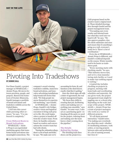For Chase Gandel, a project manager at NPARALLEL + Atomic Props, life moves between precision, people, and purpose. Based in his hometown of Crystal, Minnesota, Gandel manages a portfolio of brand activations and tradeshow exhibits across the United States. “I fell into this career while pursuing other avenues,” he says. “I’ve embraced it completely.” From Midwest Roots to Brand Activations NPARALLEL + Atomic Props is an experiential marketing agency that transforms brand activations into meaningful connections. The 82 Jan/Feb/Mar 2026 Exhibit City News
