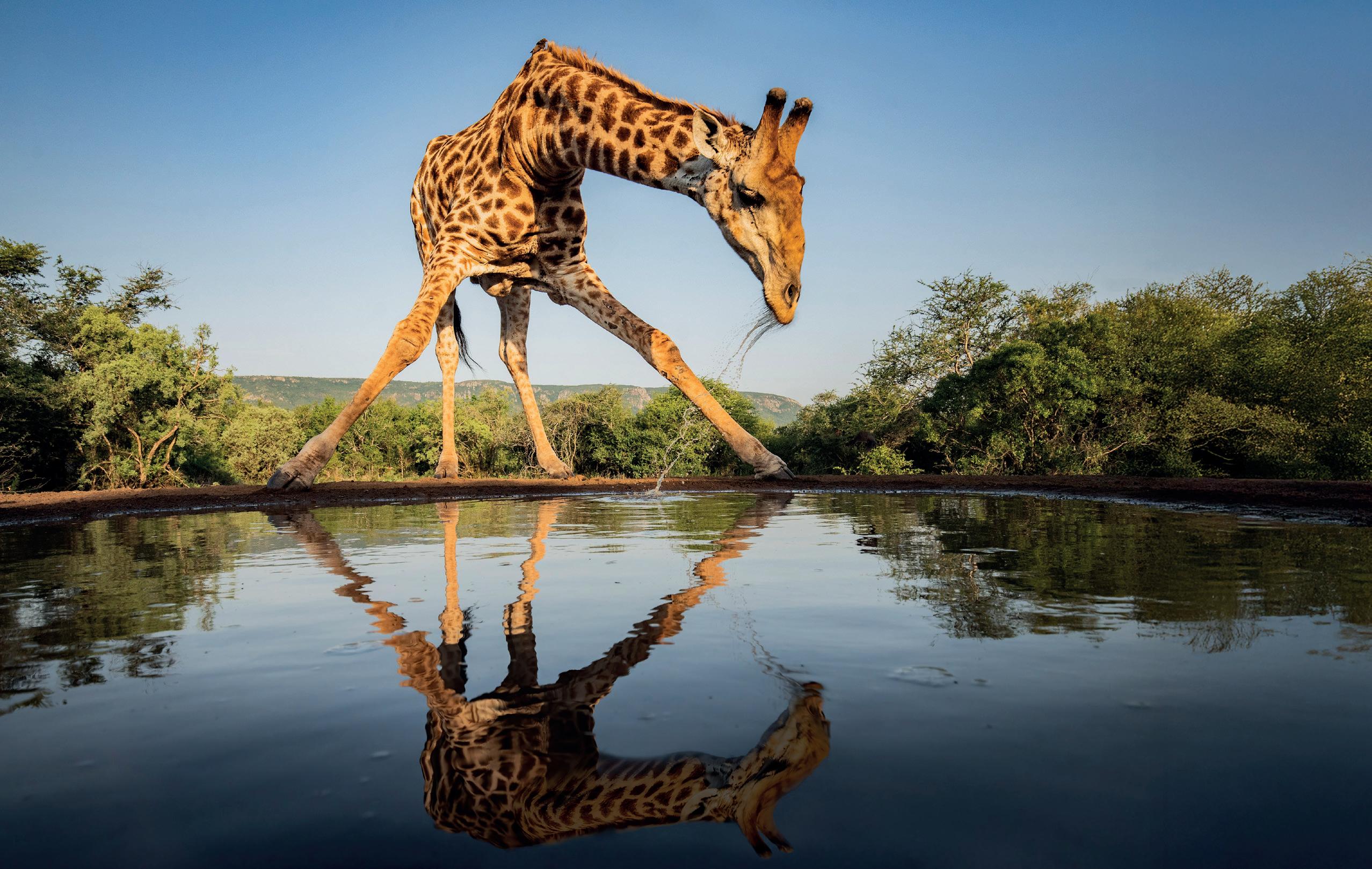 “This moment of magic was captured in a South African game park. It was the giraffe’s fourth cautious approach to the watering hole, and the first time it actually stopped to drink. Luckily, my lens was just wide enough to catch both the giraffe and its reflection – talk about perfect timing! I was delighted.”