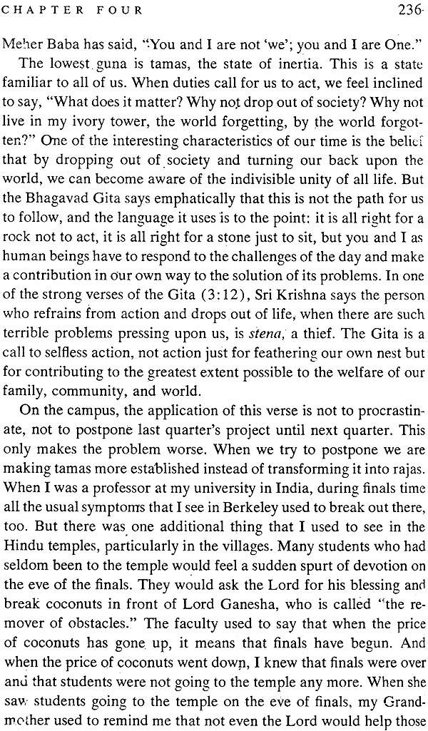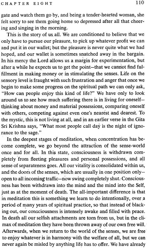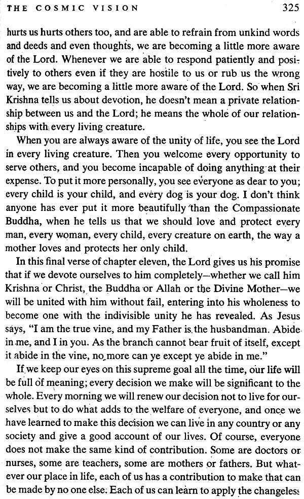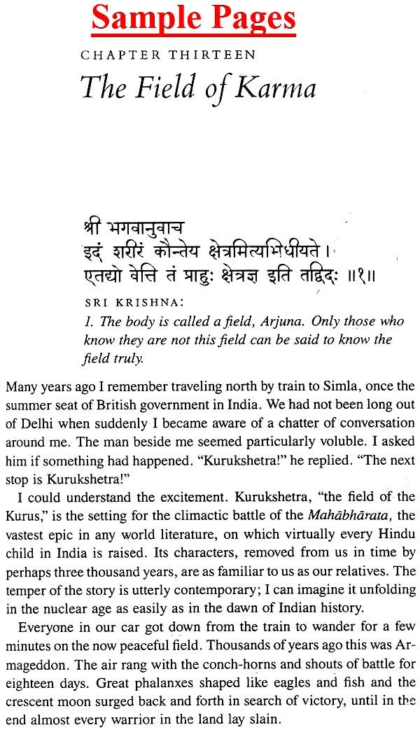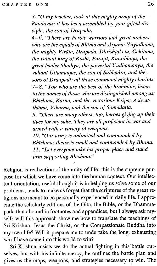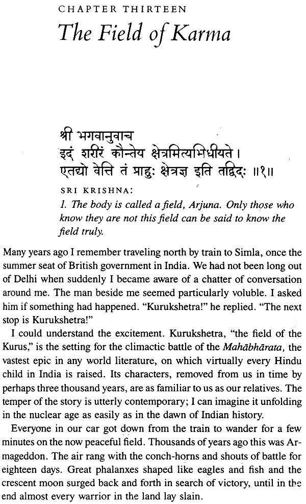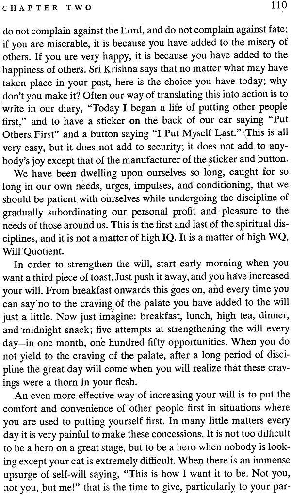 Physical demonstrations are often necessary to prove spiritual truth. It is not a description of a war between cousins, but between the two natures within us, good and evil.” The battle described in the Bhagavad Gita is not confined to any particular historical setting. Sri Krishna's message is still as valid today as it was centuries ago; and it will remain that way tomorrow, because it represents the truth of eternal life, that the fiercest battle we have to fight to do is to confront all that is selfish, wilful, and detached within us. Today, when the world is torn apart by war, when violence stalks our streets and invades our homes, when anger destroys our relationships and division invades our minds, Sri Krishna's timeless words given to us in the Gita have urgent practical value.