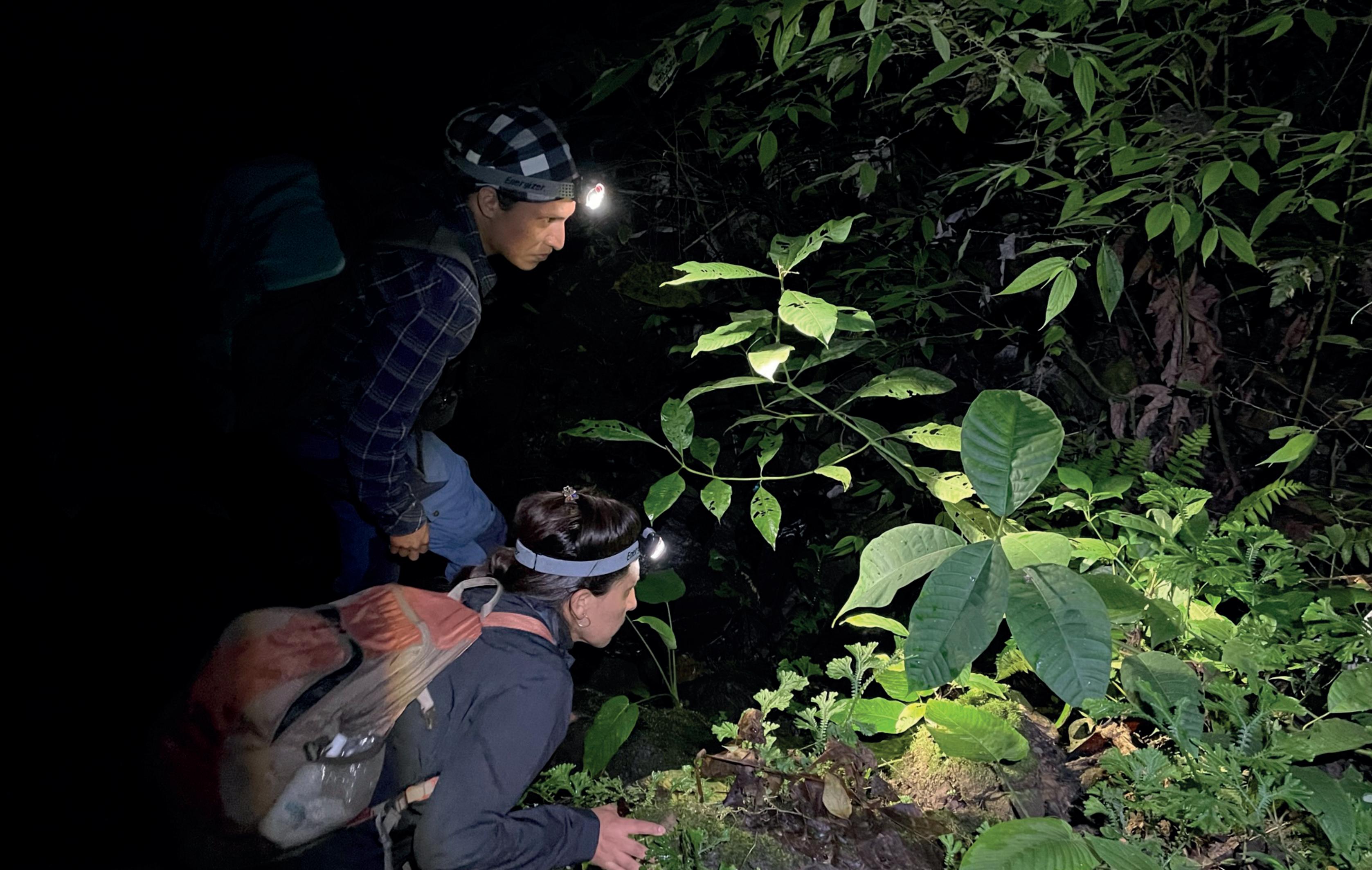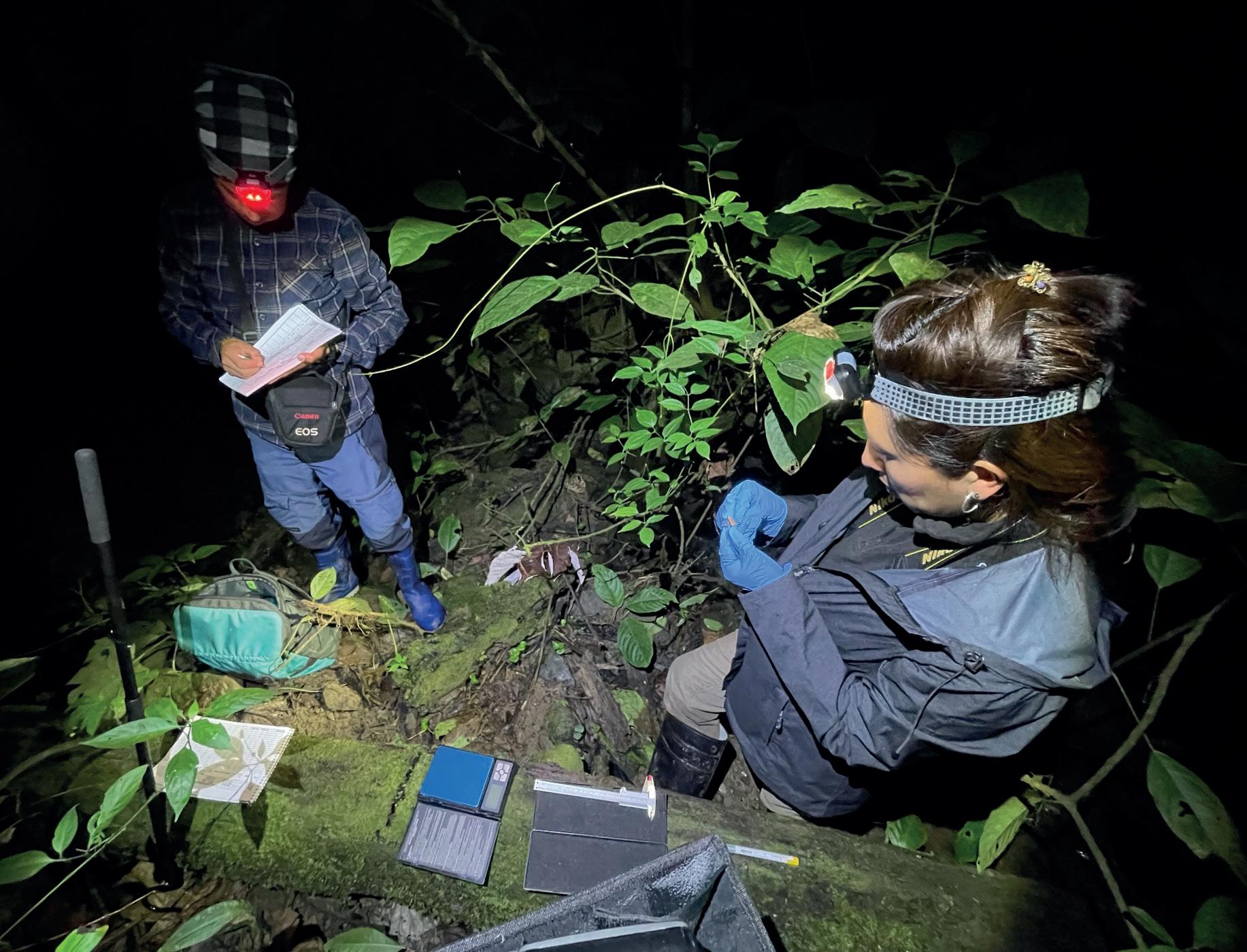 After visiting two local communities and cooking some dinner, we headed out to the Atelopus site. This is a fast-running and very steep stream that trails down the mountainside. Equipped with headlamps, waders, cameras and long-sleeved tops we clambered down the stream in search of the toads. Several data sets were required for each toad. Basic health checks such as size (SVL) and weight were necessary to understand the toads. Females are typically larger than males and as with a few species of Atelopus, the three-coloured harlequin toad population is dominated primarily by males. Females are generally larger than the males, so they are quite easy to identify.