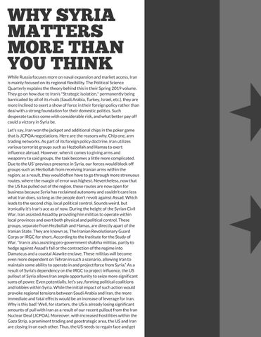 WHY SYRI A M A TTERS M ORE THA N YOU THI NK While Russia focuses more on naval expansion and market access, Iran is mainly focused on its regional flexibility. The Political Science Quarterly explains the theory behind this in their Spring 2019 volume. They go on how due to Iran's "Strategic isolation," permanently being barricaded by all of its rivals (Saudi Arabia, Turkey, Israel, etc.), they are more inclined to exert a show of force in their foreign policy rather than deal with a strong foundation for their domestic politics. Such desperate tactics come with considerable risk, and what better pay off could a victory in Syria be. Let's say, Iran won the jackpot and additional chips in the poker game that is JCPOA negotiations. Here are the reasons why. Chip one, arm trading networks. As part of its foreign policy doctrine, Iran utilizes various terrorist groups such as Hezbollah and Hamas to exert influence abroad. However, when it comes to giving arms and weaponry to said groups, the task becomes a little more complicated. Due to the US' previous presence in Syria, our forces would block off groups such as Hezbollah from receiving Iranian arms within the region; as a result, they would often have to go through more strenuous routes, where the margin of error was highest. Nevertheless, now that the US has pulled out of the region, these routes are now open for business because Syria has reclaimed autonomy and couldn't care less what Iran does, so long as the people don't revolt against Assad. Which leads to the second chip, local political control. Sounds weird, but ironically it's Iran's ace as of now. During the height of the Syrian Civil War, Iran assisted Assad by providing him militias to operate within local provinces and exert both physical and political control. These groups, separate from Hezbollah and Hamas, are directly apart of the Iranian State. They are known as, The Iranian Revolutionary Guard Corps or IRGC for short. According to the Institute for the Study of War, "Iran is also assisting pro-government shabiha militias, partly to hedge against Assad's fall or the contraction of the regime into Damascus and a coastal Alawite enclave. These militias will become even more dependent on Tehran in such a scenario, allowing Iran to maintain some ability to operate in and project force from Syria.?As a result of Syria's dependency on the IRGC to project influence, the US pullout of Syria allows Iran ample opportunity to seize more significant sums of power. Even potentially, let's say, forming political coalitions and lobbies within Syria. While the initial impact of such action would provoke regional tensions between Saudi Arabia and Iran, the more immediate and fatal effects would be an increase of leverage for Iran. Why is this bad? Well, for starters, the US is already losing significant amounts of pull with Iran as a result of our recent pullout from the Iran Nuclear Deal (JCPOA). Moreover, with increased hostilities within the Gaza Strip, a prominent trading and geostrategic area, the US and Iran are closing in on each other. Thus, the US needs to regain face and get