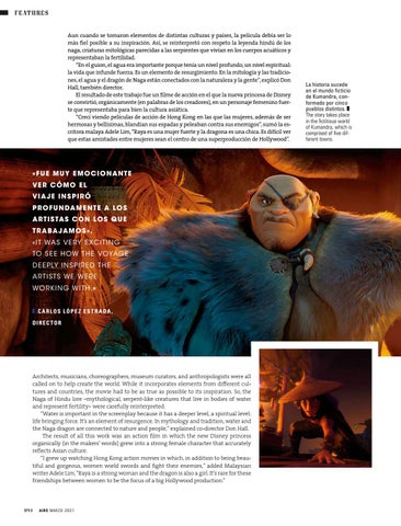 FEATURES Aun cuando se tomaron elementos de distintas culturas y países, la película debía ser lo más fiel posible a su inspiración. Así, se reinterpretó con respeto la leyenda hindú de los naga, criaturas mitológicas parecidas a las serpientes que vivían en los cuerpos acuáticos y representaban la fertilidad. “En el guion, el agua era importante porque tenía un nivel profundo, un nivel espiritual: la vida que infunde fuerza. Es un elemento de resurgimiento. En la mitología y las tradiciones, el agua y el dragón de Naga están conectados con la naturaleza y la gente”, explicó Don Hall, también director. El resultado de este trabajo fue un filme de acción en el que la nueva princesa de Disney se convirtió, orgánicamente (en palabras de los creadores), en un personaje femenino fuerte que representaba para bien la cultura asiática. “Crecí viendo películas de acción de Hong Kong en las que las mujeres, además de ser hermosas y bellísimas, blandían sus espadas y peleaban contra sus enemigos”, sumó la escritora malaya Adele Lim, “Raya es una mujer fuerte y la dragona es una chica. Es difícil ver que estas amistades entre mujeres sean el centro de una superproducción de Hollywood”.