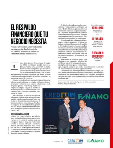 Los créditos mayores a El objetivo de cada uno de los especialistas y colaboradores de Fínamo, así como de Creditum, es que sus clientes los resuelven en consoliden todos sus proyectos con éxitiempo récord. to. Los planes integrales están hechos a la medida de ellos y el trabajo siempre se enfoca en aumentar su eficiencia, rentabilidad y continuidad en el mercado. De este modo, los valores que distinde experiencia guen a esta sociedad son: el liderazgo, son los que tienen la innovación, el dinamismo, la pasión Fínamo y Creditum, y el trabajo en equipo. Además, ambas respectivamente. instituciones tienen presencia en todo el territorio nacional. Cabe señalar que Creditum califica el financiamiento, dependiendo de un análisis del flujo de los estados de cuenta bancarios de los solicitantes. de crédito son Igualmente, el plus que ofrece esta aceptadas. alianza es que cualquier solicitud de crédito se puede llevar a cabo de manera digital, mientras que la respuesta es ágil, ya que la atención que recibe cada interesado en obtener un financiamiento es directa y personalizada. Como resultado, ofrecen productos como crédito simple, crédito puente y arrendamiento puro. Las empresas pueden precalificarse en tres minutos en el website de Creditum. Todas estas ventajas, sin duda, posicionan a ambas compañías como líderes en el mercado.