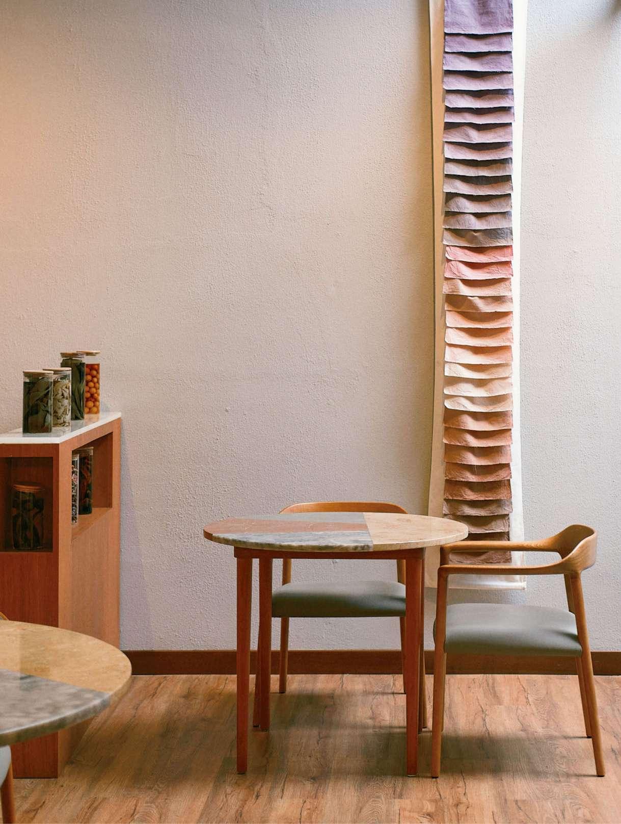 El diseño en tonos neutros –propios de la piedra caliza local– contrasta con los bordados artesanales.