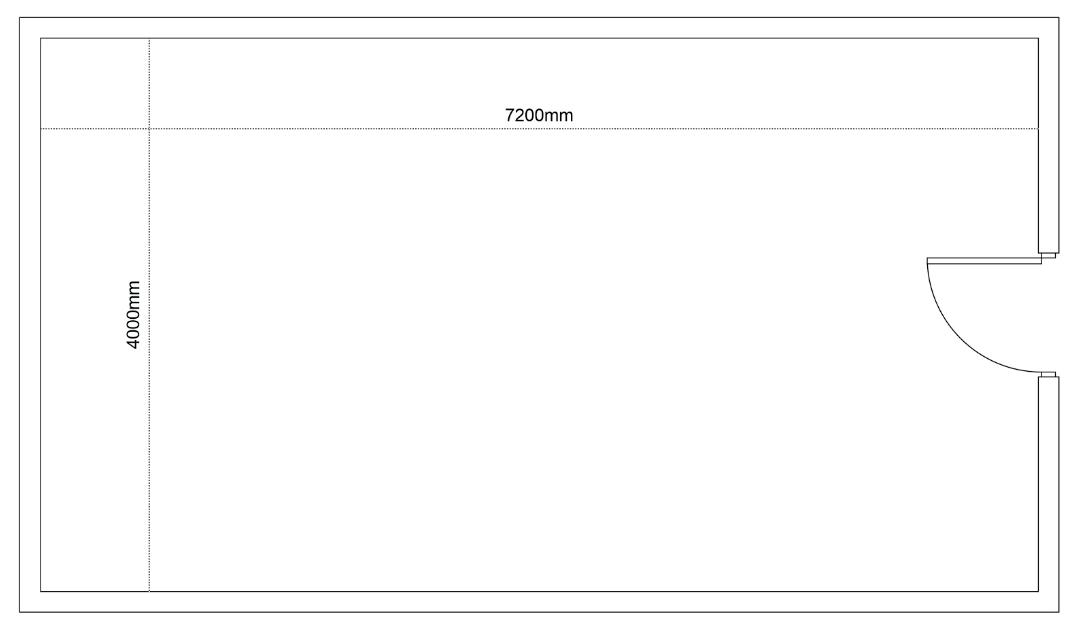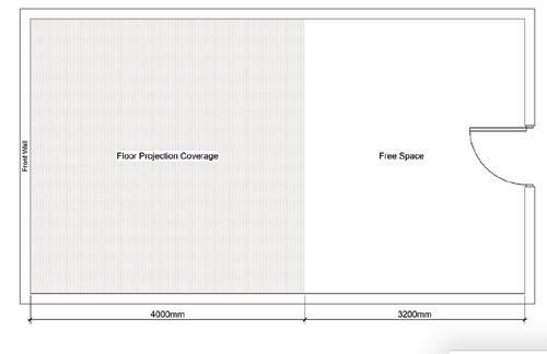 Rummet er rektangulært, 4000mm bredt og 6000mm langt. Området der er indstillet til projektion, er fri for vinduer og døre. Der kræves en minimumslofthøjde på 2850mm i rummet for at opnå den ideelle projektionshøjde på 2250mm.