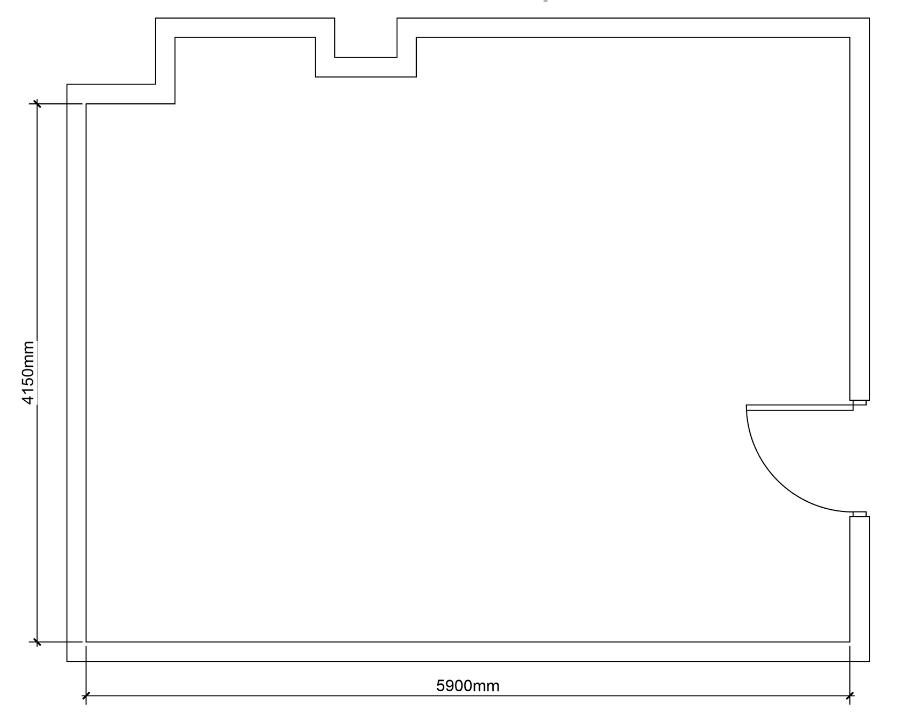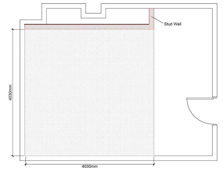 Dans ce cas, l’espace est de 4000x4000mm et la hauteur minimale du plafond est de 2850mm, la porte doit se trouver sur le mur désigné comme étant l’arrière. Dans ce type d’espace, la totalité de la surface au sol est projetée et les quatre murs sont couverts sur une hauteur de 2250 mm. Ceci signifie qu’aucun matériel ne peut être conservé dans cet espace.