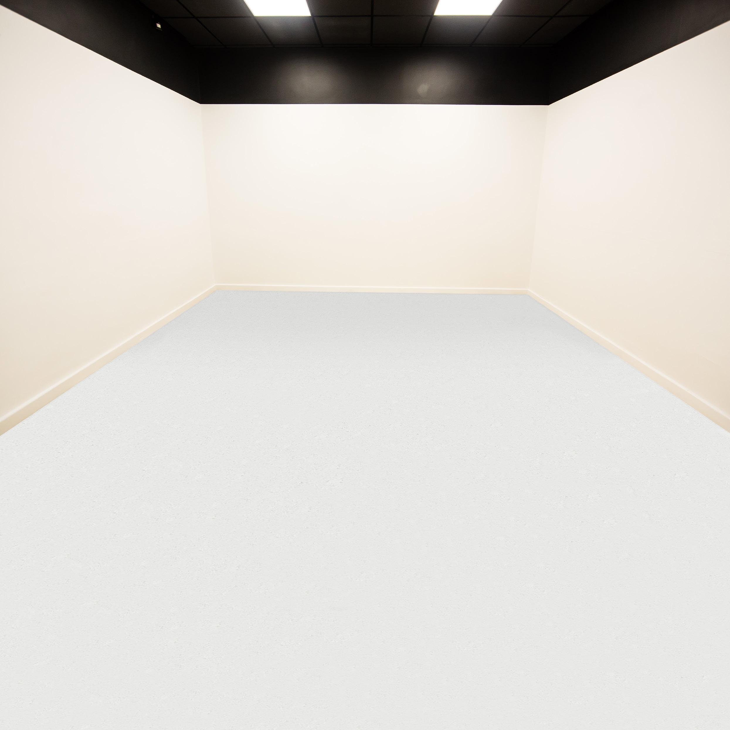 Projection au sol : Un vinyle gris clair résistant et facile à nettoyer, tel que le Contract Plus (gris froid clair 0009) de Tarkett, doit être installé par un poseur qualifié.