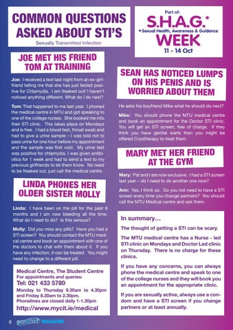 JOE MET HIS FRIEND TOM AT TRAINING Joe: I received a text last night from an ex-girlfriend telling me that she has just tested positive for Chlamydia. I am freaked out! I haven’t noticed anything different. What do I do next? Tom: That happened to me last year. I phoned the medical centre in MTU and got speaking to one of the college nurses. She booked me into their STI clinic. This takes place on Mondays and is free. I had a blood test, throat swab and had to give a urine sample – I was told not to pass urine for one hour before my appointment and the sample was first void. My urine test was positive for chlamydia. I was given antibiotics for 1 week and had to send a text to my previous girlfriends to let them know. No need to be freaked out, just call the medical centre.