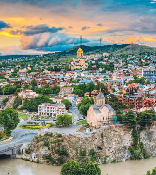 Set upon a verdant hilltop in the Kakheti region, the pretty town of Sighnaghi, also known as the ‘Paris of Georgia’, boasts far-reaching views of the Khaketi Winelands against a dramatic backdrop of the towering Greater Caucasus mountain ranges. Stroll along the cobbled streets lined with 18thcentury dwellings, overhanging wooden balconies and terracotta tiled roofs, and visit a 16th-century wine cellar to sample some of the region’s delicious red and white wines that have been produced here for over 300 years.