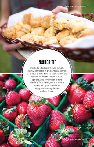 INSIDER TIP Thanks to Charleston’s mild climate, freshly-harvested ingredients are served year-round. Take time to explore farmers markets and taste seasonal menu options. And remember to take specialty food items, such as benne wafers and grits, in order to enjoy Lowcountry flavors while at home.