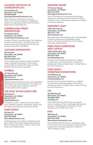 CULINARY INSTITUTE OF CHARLESTON (CIC) 66 Columbus St. Charleston, SC 29403 843.820.5090 culinaryinstituteofcharleston.com Taste the future of Charleston’s culinary scene in the Culinary Institute of Charleston’s student-run restaurants, Relish and 181 Palmer. Reservations: OpenTable.com.