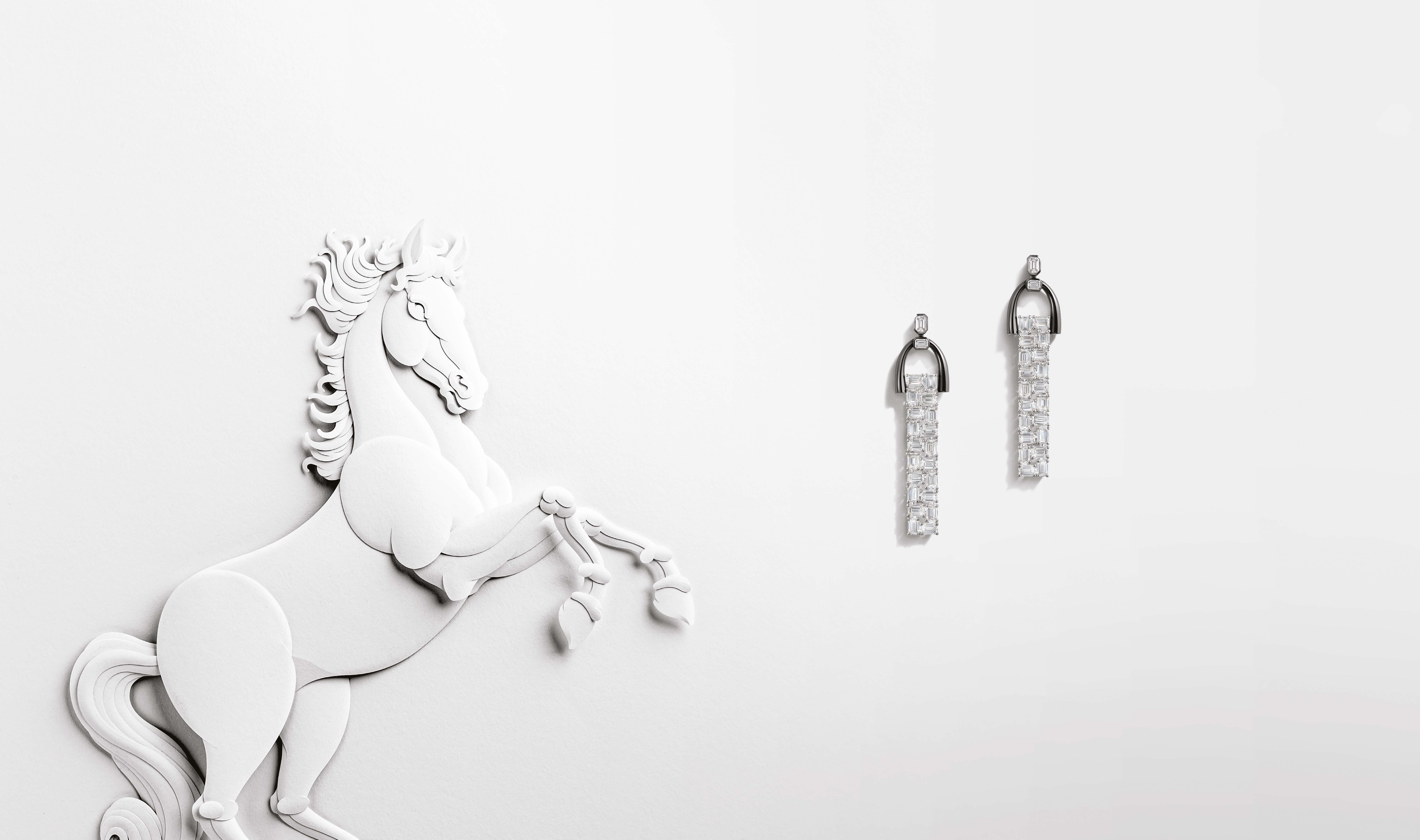 white gold stirrup bangle, a D-ring bitinspired enamel tennis bracelet, and black diamond and gold stirrup earrings.