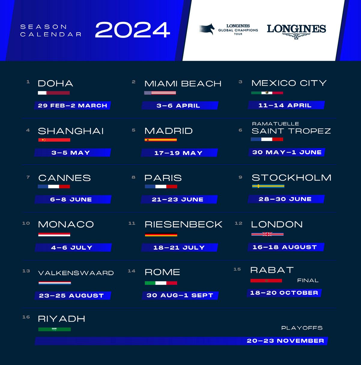 With 16 stops on the 2024 tour, horses and riders have faced challenges in technical courses, diverse arenas, and intense competition. Top talent competed across Asia, Europe, The Americas, Africa, and the Middle East, starting in Doha and travelling to prominent locations like Miami Beach, Mexico City, Monaco, Paris, Shanghai, and more. The tour culminates this weekend in Rabat, Morocco, where riders have one final chance to earn points toward the 2024 Championship title and a golden ticket to the GC Playoffs in Riyadh next month.