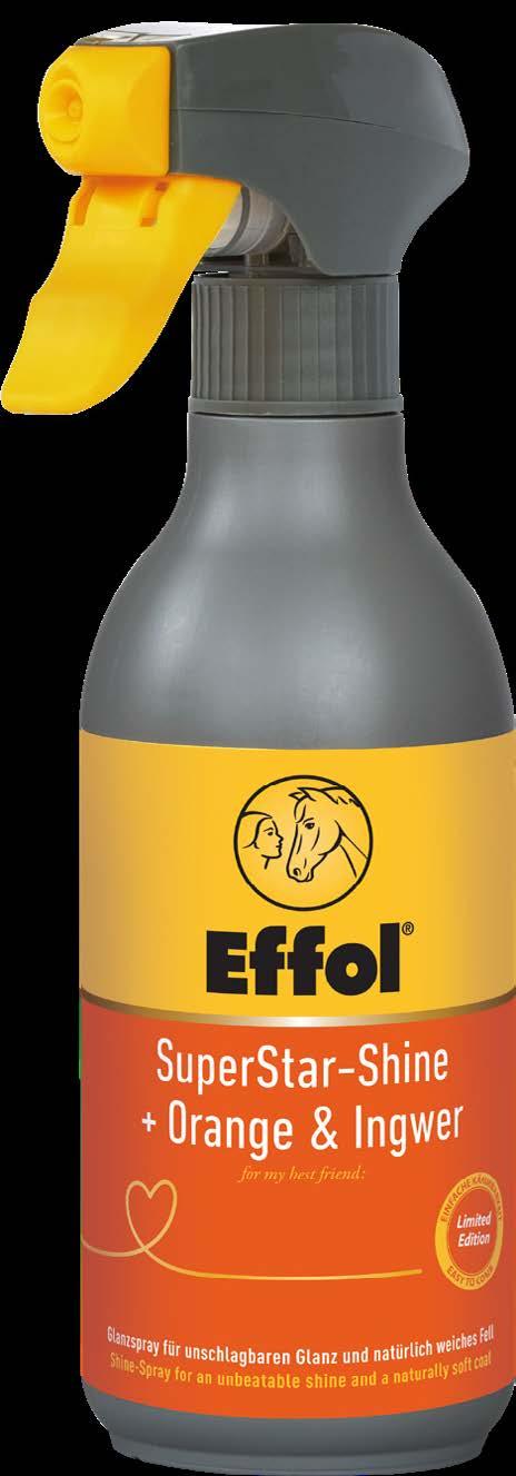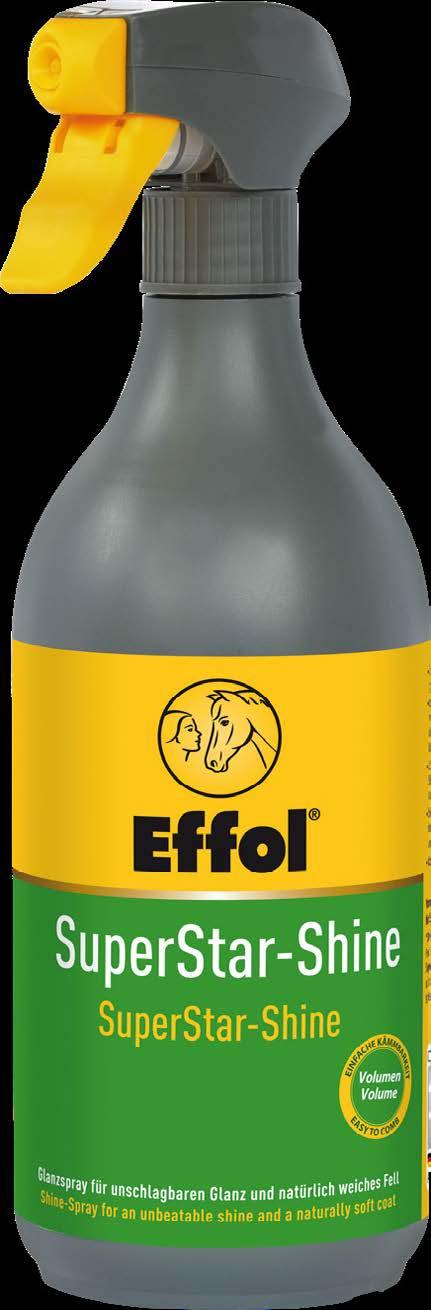 Effol Super- Star-Shine will give your horse or pony a more brilliant shine than ever before – but without the coat, mane and tail taking on an artificial feel. Grooming becomes easier - and the effect is guaranteed to last for several days. The shinespray will help you to undo tangles as well as to remove particles of shavings and straw with virtually no effort. The tail and mane will take on more body and bounce as well as greater volume. This product means you can successfully avoid the problem of split, dry hair.