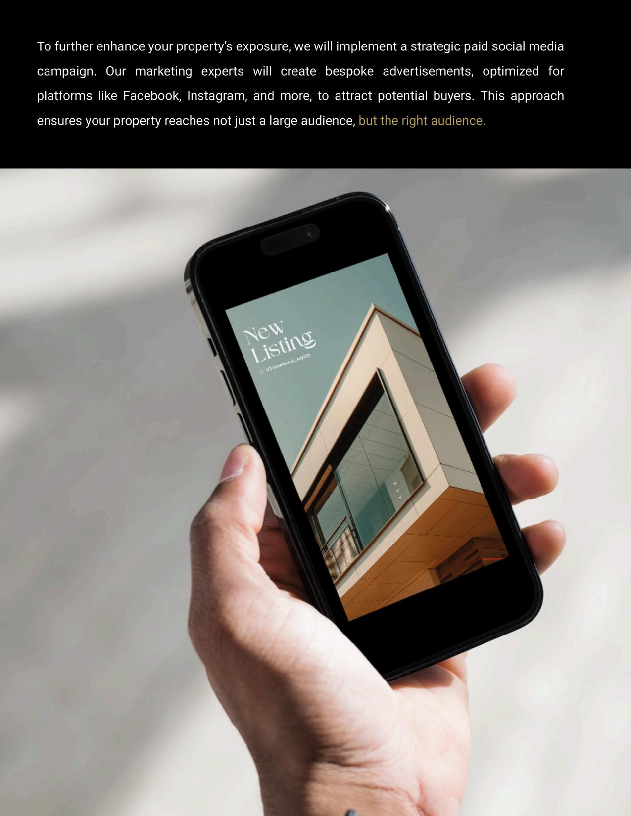To further enhance your property’s exposure, we will implement a strategic paid social media campaign. Our marketing experts will create bespoke advertisements, optimised for platforms like Facebook, Instagram, and more, to attract potential buyers. This approach ensures your property reaches not just a large audience, but the right audience