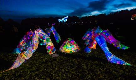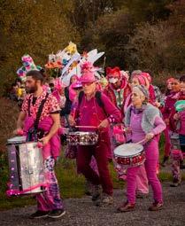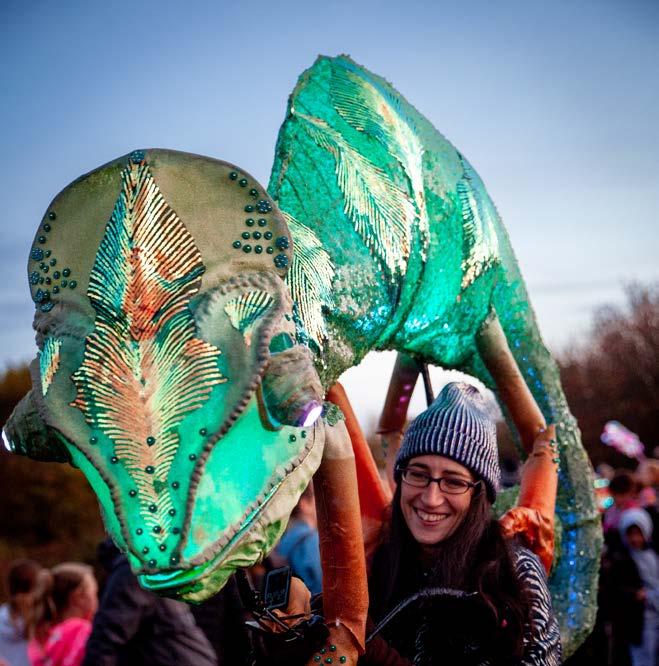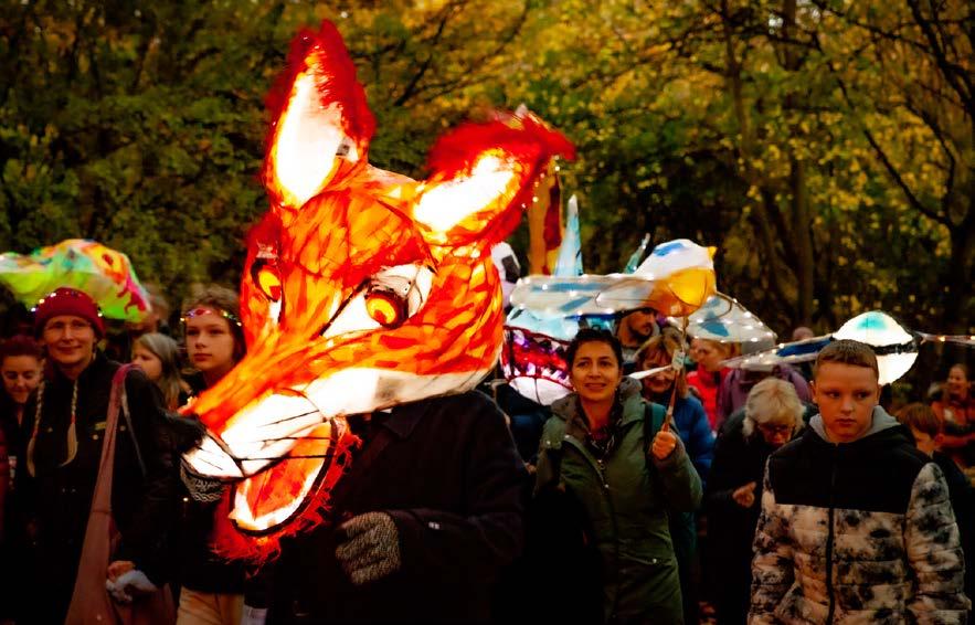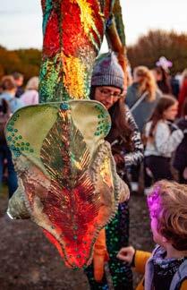 witness, finishing off an immer sive celebration of light and fun as we move into the longer, darker nights of winter. Since 2008 there has been an event at this time of year for families and the local commu nity, journeying through the woods to the viewpoint to admire the views as dusk falls and the lights come on. Initially, it was organised by Sheffield City Council, with fireworks and story-telling. Later it became a lantern procession, organised primarily by the Friends of Parkwood Springs, though still with important support from the council’s Parks and Countryside service as well as local councillors. This event was the first one held since 2019, and the lanterns were made by nearby schools and commu nity groups, with the help of local artists Patrick Amber and Carol Schofield. Other locals just made their own lanterns, or came along dressed up with lights. The Sheffield Samba Band are regulars here, but this year for the first time they were