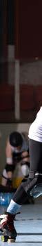 Quick overview: the game of roller derby is played on an oval track using quad skates. A 15-skater team plays two 30-minute periods which are made up of “jams”, twominute phases in which each team fields five skaters and has an opportunity to score points. One of the skaters is called a “jammer”, who scores the points and wears a star helmet cover to signal their position. The four remaining skaters are called “blockers” and their role is to stop the jammer scoring. The jammers’ aims are to lap the opposing blockers, gaining a point for each one they pass, while also navigating the blockers’ defence and any offense from their own team. Should you find yourself at a roller derby game, expect high energy, amazing skating skills and, most importantly to us, plenty of team camaraderie. The team with the most points at the end of the game wins.