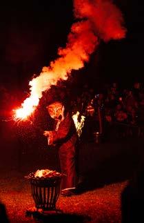 For a couple of hours the band played; lanterns were held aloft as they made their way up through the trees and narrow pathways until they returned to the lower field. It truly was a sight to behold: drummers and lanterns emerged slowly and almost magically from the trees into the now-darkened city park. As they gathered in the field below, and the Samba Band played one last tune, the final part of the evening’s entertain ment started – an appearance by the Mister Fox dance troupe. Their show tells various stories about the lives and adventures of a group of foxes, all done in full costume, and with only burning torches and fire to illu minate the performance. This was a really spectacular thing to